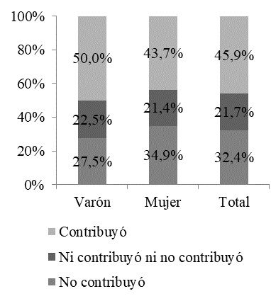 Al observar qué sucede en el caso de los intervalos de edad, encontramos que el reconocimiento de contribución es muy similar al valor poblacional, incluso unos puntos por debajo, a excepción del rango que va entre 30 y 44 años.