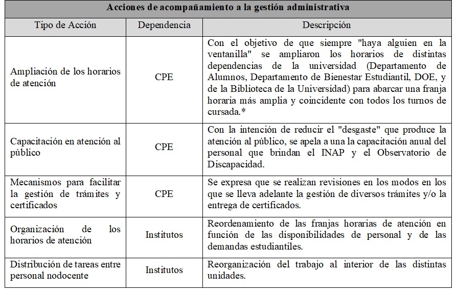 - Acciones de acompañamiento a la gestión administrativa: refieren a revisiones y ajustes realizados por la institución a los fines de que resolver cuestiones administrativas no sea un factor que obstaculice las trayectorias educativas y ni que las/os aleje de la Universidad.