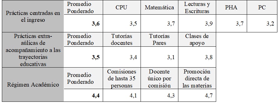 Como rasgo general, resulta importante destacar que son las instancias más universales, las que mejor se valoran. Así, tal como figura en la Tabla 2, el conjunto que reporta mayor contribución son las prácticas vinculadas con régimen académico (con un 4,4 de contribución promedio), seguidas por aquellas centradas en el ingreso (3,6 de contribución promedio) frente a una contribución menor para las prácticas extra-áulicas de acompañamiento a la trayectoria educativa (3,5 puntos en promedio).