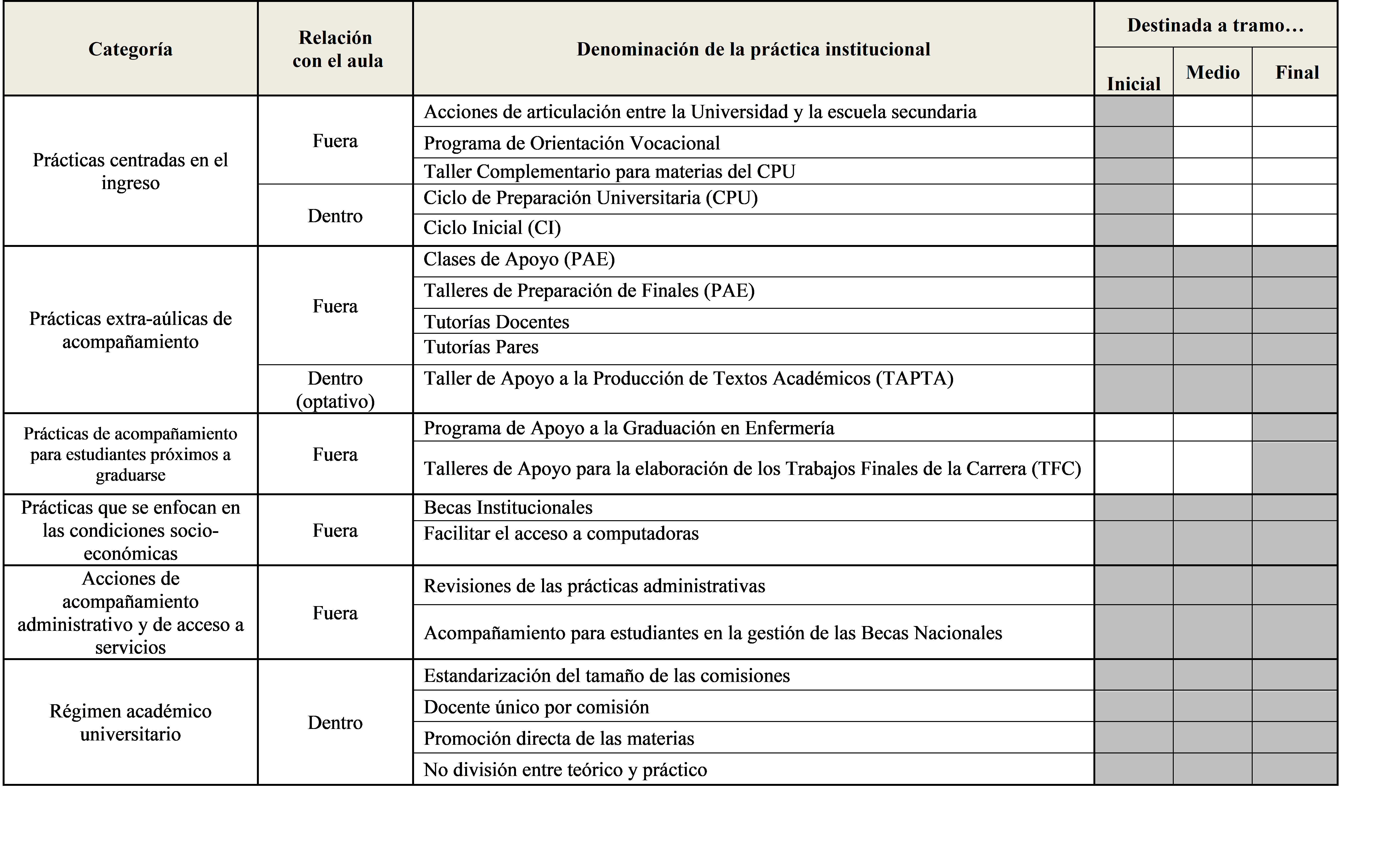 Cada una de esas categorías aglutina en su interior distintas prácticas, tal como se puede observar en la siguiente Tabla. Para cada una de ellas, distinguimos el tramo de la carrera de las/os estudiantes a los que se destinan y si se realiza dentro o fuera del aula. Producto de este entrecruzamiento, a continuación, se clasifican las prácticas institucionales:
