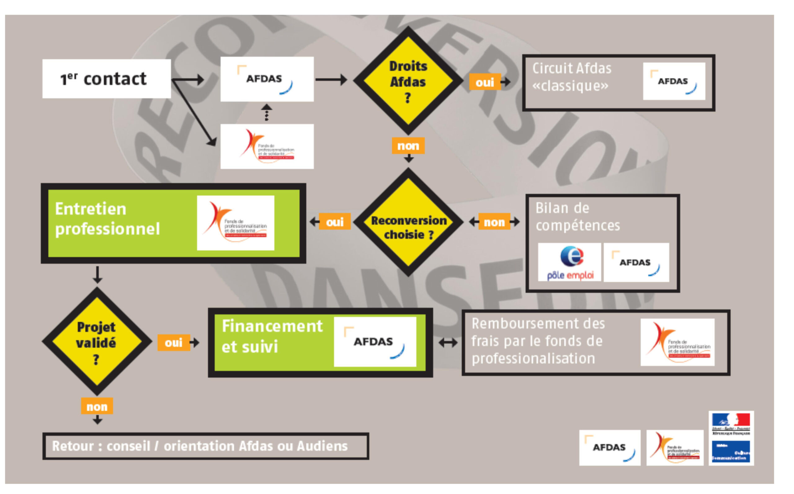 « J’ai contacté l’AFDAS pour voir s’il y avait moyen d’avoir un financement [pour une formation en Licence de langue]. Ils m’ont fait comprendre que ce n’était pas impossible, mais qu’il y avait peu de chance. Normalement, c’est pour des années diplômantes et là c’est une formation de quatre ans. Ils m’ont fait comprendre que je pouvais faire un dossier, mais que c’était compliqué, qu’il ne fallait pas trop compter dessus. Finalement, je n’ai même pas fait le dossier. Je me suis dit : “bon, on laisse tomber”. » (Marie, née en 1979, danse, sortie du métier en 2012 après 12 ans de scène)