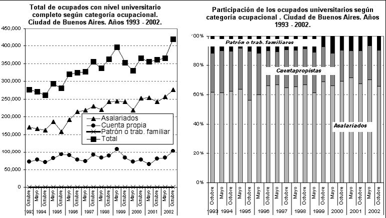 De la población ocupada de la Ciudad, los universitarios con estudios finalizados representaban el 13% en 1980, mientras que en 2002 pasaron a conformar el 35,3%. En el caso de estudiantes universitarios empleados, los mismos constituían el 12% y alcanzaron un 19% al final de período. En total, los universitarios (con estudios finalizados y no finalizados) de la Cuidad pasaron de representar el 25% al 54% de la PEA, es decir que, en veinte años, la Ciudad duplicó la cantidad de trabajadores universitarios (cuadro “Distribución porcentual de la población ocupada por máximo nivel de instrucción alcanzado en la Ciudad de Buenos Aires. Años 1980-1990/2002” al final del capítulo). Esto sin duda representa una transformación notable de la estructura social de la Capital Federal. El crecimiento de los trabajadores universitarios se explica, básicamente, por el desarrollo de las actividades de servicios que demandan un gran número de profesionales. En 2002, los universitarios ocupados en las actividades de servicios pasaron a representar el 74% de la población ocupada. Este crecimiento se dio en paralelo al estancamiento relativo de la actividad de los profesionales autónomos a lo largo de los noventa.
