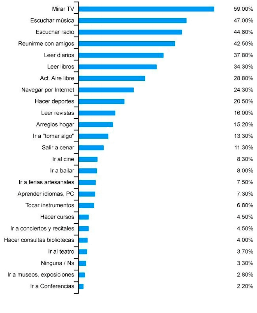 El gráfico siguiente expresa los distintos usos del tiempo libre de los habitantes de la Ciudad de Buenos Aires. Como puede apreciarse, las tres actividades mayoritarias corresponden a mirar televisión (59%), escuchar música (47%) y radio (44,80%).[3] Si bien están asociadas con la vida privada, estas prácticas suponen un consumo de medios masivos y son la puerta de entrada de productos culturales globales, que van desde información hasta música, películas y series.