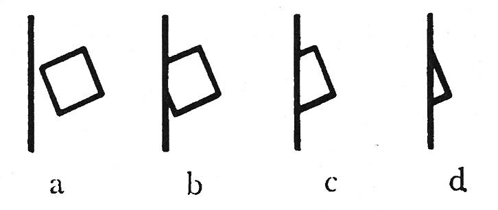 Las composiciones de imágenes tienen una doble función comunicativa y limitadora. Por un lado, dirigen la atención del espectador hacia aspectos relevantes mediante la repetición de motivos, formas o contrastes fuertes similares. Por otro lado, esta repetición y resaltado de determinados aspectos también limita la percepción del espectador, al relegar a un segundo plano otras posibilidades. Rudolf Arnheim ilustró este mecanismo psicológico general de percepción, que también puede darse en los grupos de imágenes, con la ayuda de la figura 1, que se muestra a continuación: vista aisladamente, la figura “d” puede reconocerse como todo tipo de cosas. Sin embargo, en conjunto con las otras figuras “a”, “b” y “c”, “probablemente nos parezca la esquina de un cuadrado que está a punto de desaparecer detrás de una pared” (Arnheim, 2000, p. 52). La interacción de las figuras limita el número total de posibilidades de percepción de la imagen, al tiempo que pone de relieve una posibilidad concreta (“un cuadrado que está a punto de desaparecer detrás de una pared”).