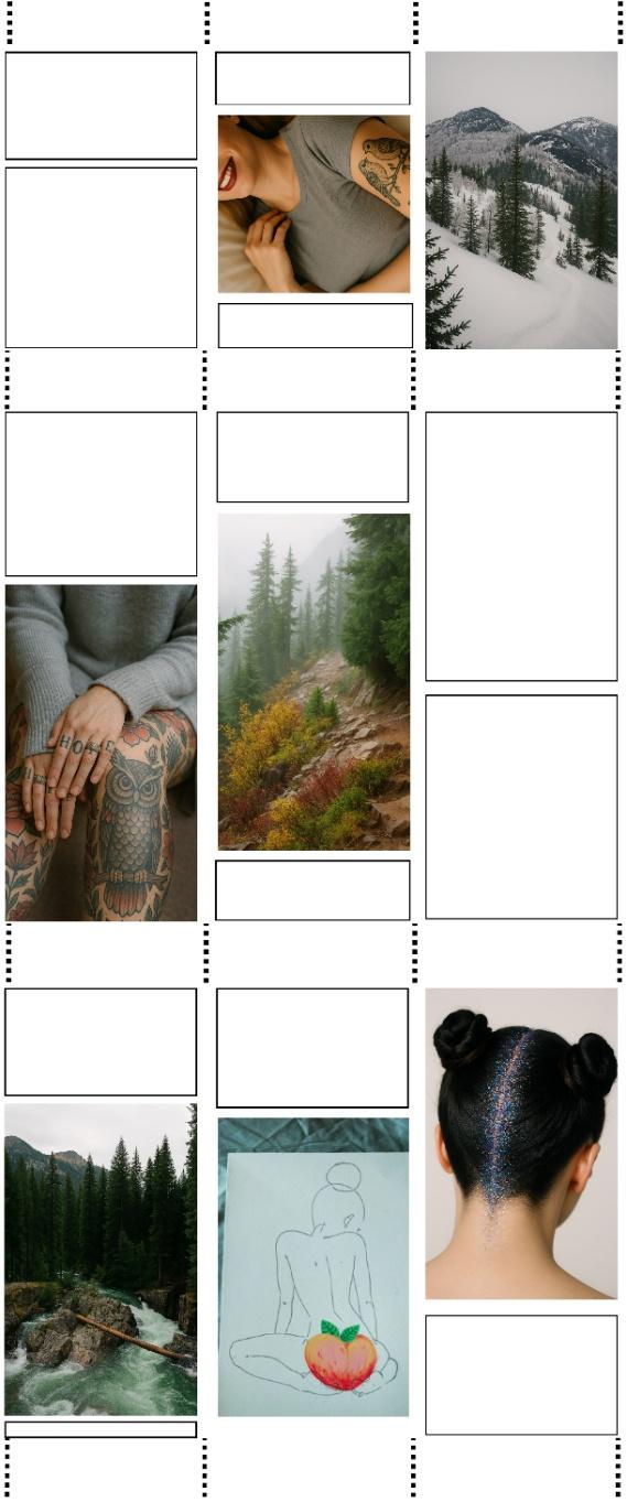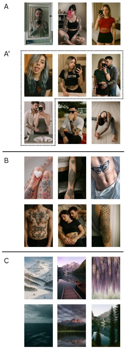 Figura 2: recopilación de imágenes individuales en categorías. Fuente: imágenes propias, creadas con herramientas de IA y Photoshop, basadas en plantillas de imágenes similares publicadas en un blog real de Tumblr.