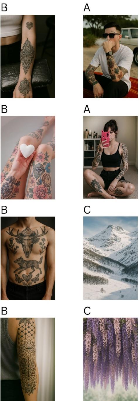 Otra acentuación significativa surge de la interacción entre las imágenes de las categorías B y C, como se muestra en la figura 3. El análisis de las imágenes de estas categorías revela similitudes estéticas entre las fotografías de tatuajes de la categoría B y las representaciones de la naturaleza de la categoría C, sobre todo en lo que respecta a las estructuras ornamentales recurrentes, los motivos y las familias de colores predominantes. Estas similitudes también son evidentes en las capturas de pantalla de la figura 4, donde las imágenes irrelevantes se han cubierto de blanco.