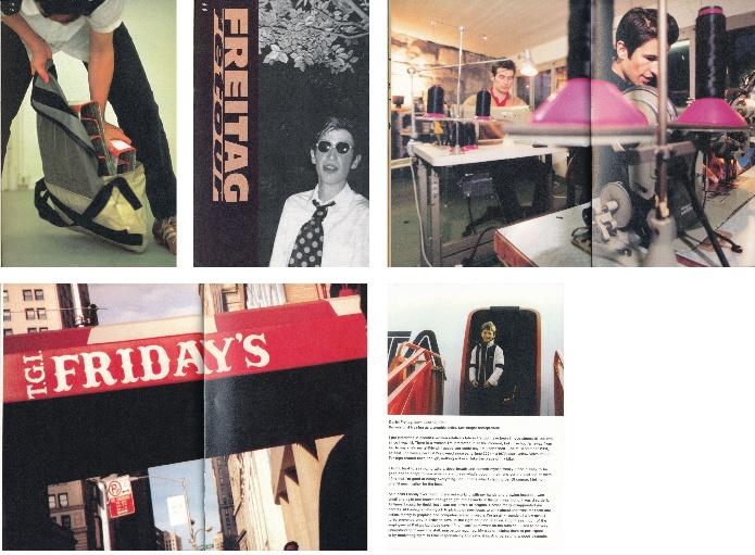 El segundo enfoque puede ilustrarse con la publicación del libro publicitario o catálogo de la marca de bolsillo Freitag de 2001 (Müller, Küng y Spinatsch, 2001). La característica única de esta publicación publicitaria era, y sigue siendo, el uso de una técnica de montaje con un inmenso número de más de 1.000 fotografías como medio de construcción de la imagen, incluso antes del uso generalizado de los medios digitales. Lo que distingue a este conjunto de imágenes de las actuales actuaciones mediáticas de la marca en Facebook o Instagram es, desde el punto de vista estructural, únicamente el hecho de que el conjunto de imágenes de 2001 no se presenta como un weblog digital, sino en forma de catálogo analógico.
