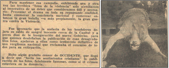 Los pies de foto utilizados antes de 1962 eran el recurso de defensa para atacar al partido contrario. En ocasiones, una misma foto tenía responsables distintos y se situaba en lugares diferentes de la geografía colombiana. Estas narrativas fueron “matizadas” en La Violencia en Colombia. Los pies de fotos en este libro hacen mención a la Violencia sin adjudicar los cuerpos de las víctimas a ningún partido.