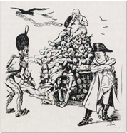 - Esta caricatura fue publicada en la revista Fantoche e iba acompañada del siguiente escrito: Ocupaba Don Miguel su pirámide sombría y no llegaban a él ni quejas del pueblo fiel ni aullidos de la jauría, pero Vázquez sin cautela ha llegado en forma activa listo a meterle candela si de su puesto no vuela con toda su comitiva. Y este hombre que derrochara oro y sangre sin tesón está viendo cara a cara que lo miden con la vara con que él midió a la nación. Al respecto de la caricatura, en la colección de las obras selectas de Pepe Gómez, se dice lo siguiente: “La imagen de la montaña de cadáveres había sido tratada ya por Pepe Gómez en 1911 en la revista Sansón Carrasco en la que publicó una caricatura basada en la fotografía de la Batalla de Palo Negro en que aparecen calaveras amontonadas. En esta ocasión la imagen es utilizada para aludir a los trabajadores asesinados durante la matanza de las bananeras. Alfredo Vázquez Cobo y la muerte están caracterizados con los uniformes de los ejércitos napoleónicos y prusianos. La cinta que lleva el gallinazo dice en francés “chantaje abajo chantaje arriba chantaje por doquier” (Gómez et al., 1987, p. 27).↵