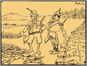 Figura 4: “Regreso de la cacería. El presidente Abadía Méndez y el general Cortés Vargas comparan resultados de cacería, después de la Masacre de las Bananeras”. Ricardo Rendón, 1928. Fuente: Banco de la República.