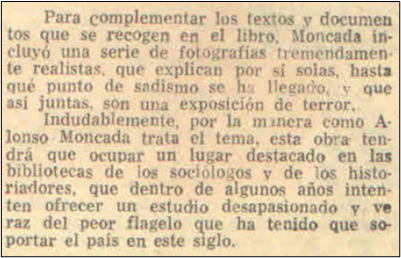 En el libro de Moncada Abello (1963) fueron muchas más las fotos susceptibles y suficientes para producir las mismas críticas, o más fuertes, que las que recibió el libro La Violencia en Colombia, ¿por qué este libro no recibió tales críticas? Se puede observar un recorte, el único, en el AGGC en el que aparece una reseña del libro en la que se expresa lo siguiente: