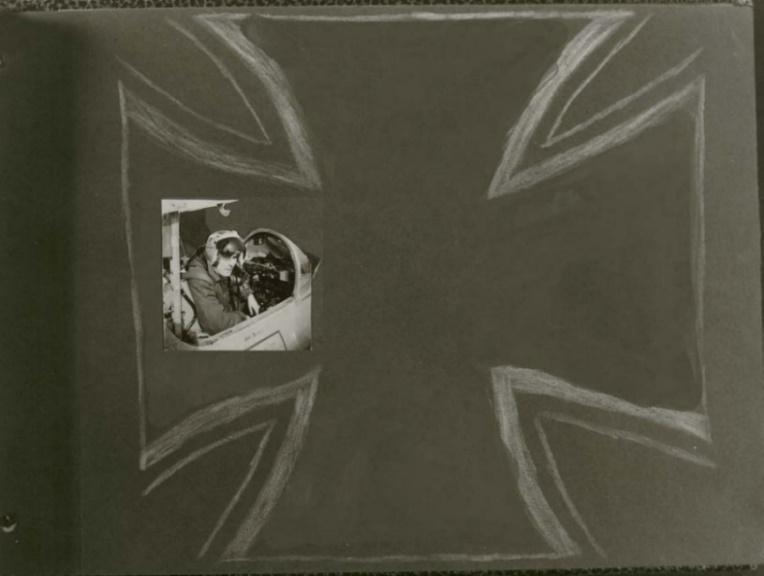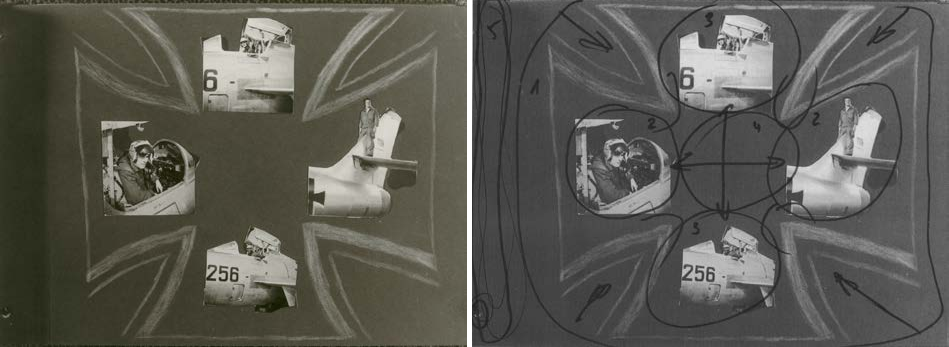 Más allá de los detalles, percibí sobre todo la disposición de los fragmentos fotográficos en la cruz militar. Vi a un hombre en poses distintas dentro y sobre un avión. También vi que la mitad de la imagen se había dejado vacía. La imagen me pareció dramática, aguda, también repelente e igualmente algo desamparada, casi infantil. Asocié la imagen con las ideas de guerra y destrucción, asociaciones que al mismo tiempo se vieron rotas por la forma no profesional con la que está diseñado el collage. La imagen dejó un sentimiento de contradicción, fragmentación, ya que es una imagen que o puede tener mucho significado, o resultar banal, o también permanecer indescifrable. Busqué en mis recuerdos imágenes similares y no encontré ninguna. No había visto nunca algo así, y en el contexto en el que apareció dejó sobre todo confusión y planteó preguntas que finalmente llevaron a que la sometiera a una interpretación metódicamente sistemática.