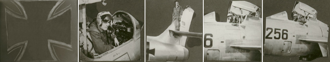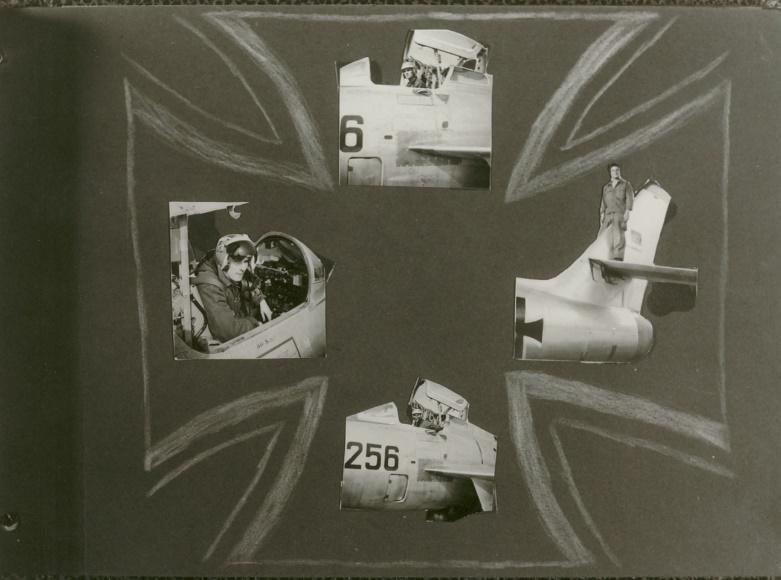Permanece la pregunta sobre en qué relación se encuentran el primer y el segundo segmento dentro de la totalidad de la imagen. Desde la perspectiva de la toma, es claro que se debe tratar de recortes de dos fotografías distintas. No estamos tratando aquí entonces con una sola foto, sino con la conjunción de fragmentos de por lo menos dos de ellas. Arriba y a un lado del alerón se pueden ver elementos para fijar la foto a un álbum. Con esto se vuelve improbable que se trate de una foto publicitaria para el entrenamiento de pilotos de las fuerzas armadas.