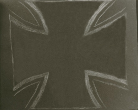 El dibujante ha pintado la cruz con esmero y de manera cuidadosa. Por lo tanto, no se puede reconocer ningún distanciamiento de su simbología. Más bien, la cruz toma un significado central en la totalidad del collage debido a su función de marco de la imagen. Es posible que el tema de la imagen verse sobre el ámbito militar, la violencia y la guerra, al igual que de su legitimidad en un amplio contexto histórico. Así pues, surge la pregunta de qué es exactamente lo que se tematiza en la imagen al interior de este marco.