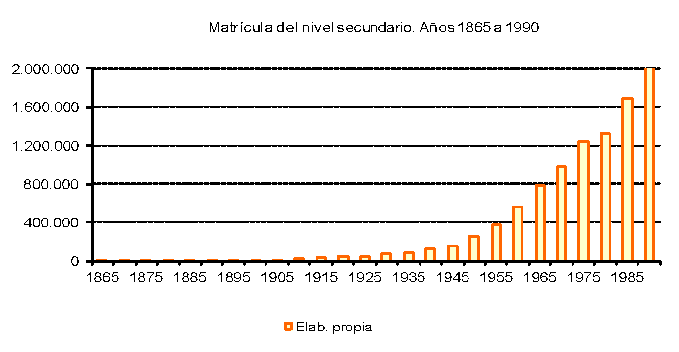 Gráfico 2. Evolución de la matrícula del nivel secundario (1865-1990)