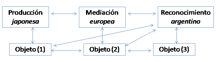 Podemos aquí decir unas palabras a nivel teórico sobre la idea de un “japonismo argentino”. En primer lugar, que el mismo confronta necesariamente con el japonismo original europeo, pero del cual estable principalmente una relación a nivel productivo: un condicionamiento ideológico. “Reconocimiento de un reconocimiento” -en este punto-, para el discurso argentino el antecedente que constituye el discurso europeo es otra mediación que se establece para llegar a apreciar la naturaleza japonesa. Ello corresponde desde ya a la recepción de obras japonesas, que pueden venir ya curadas por la interpretación europea (o norteamericana), en el sentido incluso también de una operación de traducción o de mediación. Esto podría graficarse esquemáticamente así: