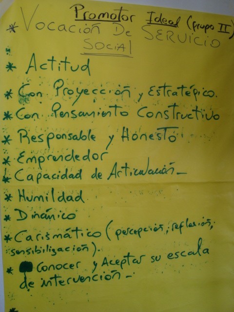 El perfil de los promotores fue definido como militantes sociales con amplia y reconocida trayectoria de trabajo comunitario, con predisposición para poner en juego sus capacidades, aportando al aprendizaje colectivo e impulsando los procesos de organización y participación popular (La bisagra, 2007: 276).