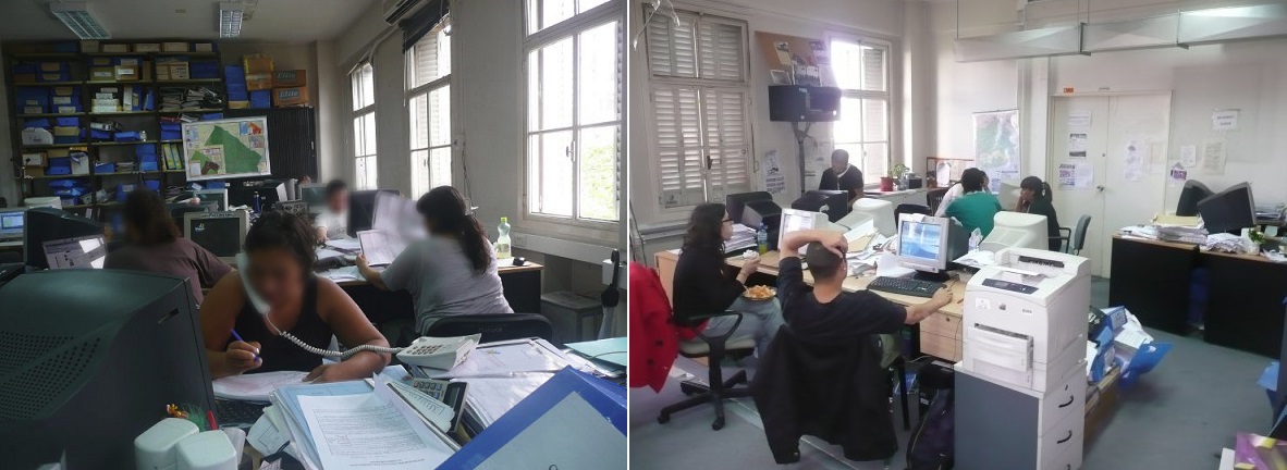 Un modo posible de comprender el énfasis del protagonismo juvenil en los procesos de cambio, puede ser atribuido a rasgos esencialistas respecto del ser joven y fue expresado en reiteradas oportunidades por referentes del gobierno o por motivos epocales. Afirmaciones por el estilo, otorgan a las/os jóvenes tener propiedades como agentes de cambio de manera intrínseca y de modo natural que les convierten en artífices de los procesos fundacionales de una nueva nación. Primero lo dijo Néstor Kirchner y luego Cristina Fernández repitió en sus discursos, “cuando la polea de la juventud se pone en marcha, el cambio es inevitable”[49]. Esta frase queda como marca de origen del llamado generacional y que expresa respecto de la juventud, “su objetivación, también como una causa consagrada por los adultos” desde arriba (Kriger, 2016: 72) y es expresión de los atributos que tuvo el vínculo forjado entre juventudes y kirchnerismo. En cualquier caso, lo que se puede afirmar es que ni en la “gestión militante” (Vázquez, 2014), ni en la gestión de las/os trabajadoras/es del estado en sus diversas procedencias, en el plantel del Mugica había “valores de neutralidad y devoción desinteresada al bien público, que se impone con una fuerza creciente a los funcionarios del Estado” (Bourdieu, 1993, 2000: 12). Por el contrario, se trató de una actitud ética o deber ser que excedió la filiación política orgánica y cruzó de manera transversal las posiciones y procedencias definiéndose como un posicionamiento político respecto del compromiso con la gestión. Ello demuestra que “el término ‘política’ es polisémico y admite un espectro amplio de significaciones” (Gené: 2019: 24) pero que es un rasgo constitutivo de los procesos de gestión pública. Esos aspectos, hicieron posible la gestión del programa y otras acciones dentro de la DNJ a pesar de las diversas concepciones que la habitaban. De ese modo, el Mugica se consolidó como espacio de intersección de las múltiples identidades que en diálogo y aun con tensiones, adhirieron a “una ética contra-burocrática, cuyos contenidos y pruebas, sin embargo, eran variables y disputables” (Perelmiter, 443). Prueba de ello, fueron los nuevos interrogantes surgidos en la ejecución del programa. Ya no se cuestionaba la ausencia del estado sino que se estructuró un nuevo eje de discusión conceptual, pero también política, hacia el interior del equipo de la dirección referido a de qué modo vamos al territorio y qué discursos se enuncian para legitimar ese trabajo. Este tipo de debate conceptual y político atraviesa de modo constante la agencia de juventud y demuestra las disputas de sentido que acontecen en las agencias del estado. Con ello, comprenderlas y reconocerla también como lugares de producción de conocimientos, aun cuando esos intercambios se dan mientras se arma algún expediente o se intercambia un mate (Fotos 3, 4 y 5).