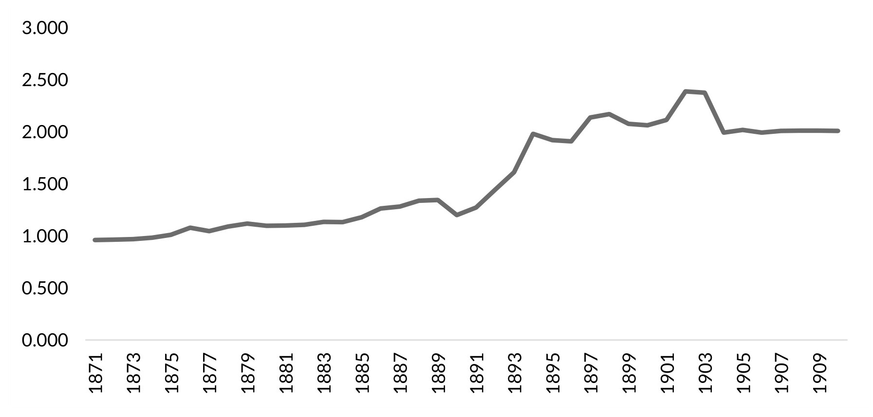 Gráfico I.3. Tipo de cambio entre el peso mexicano y el dólar norteamericano, 1871-1910