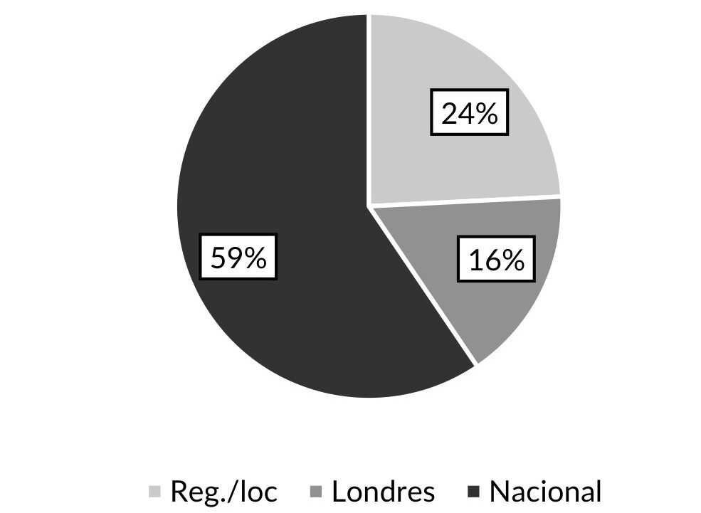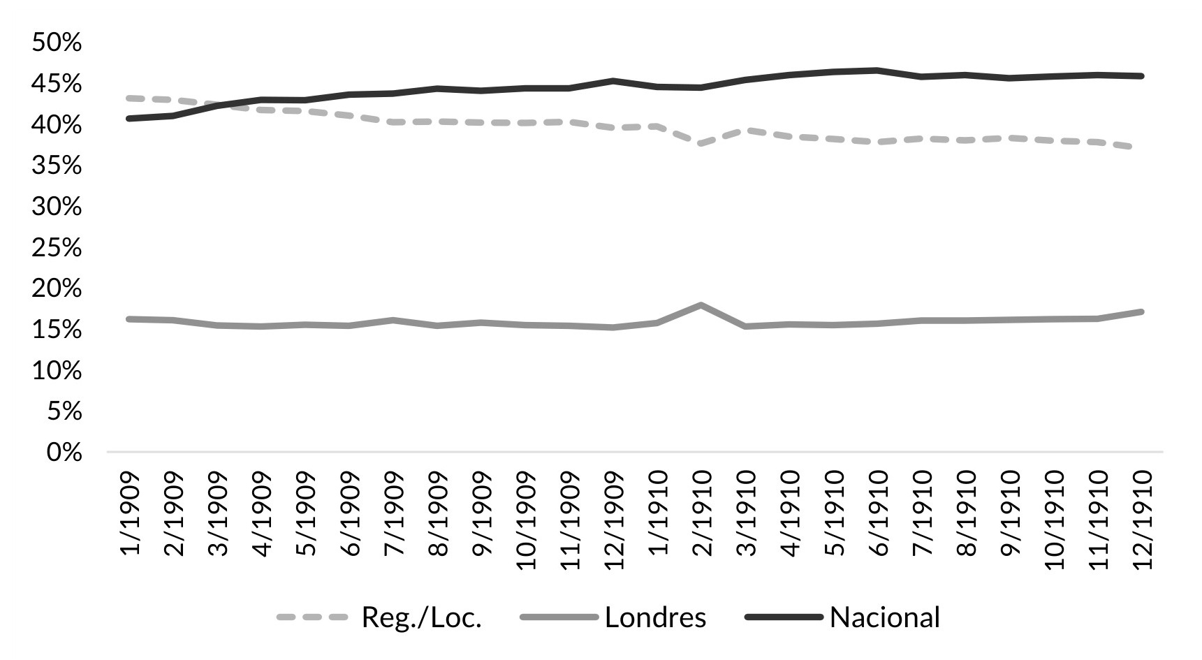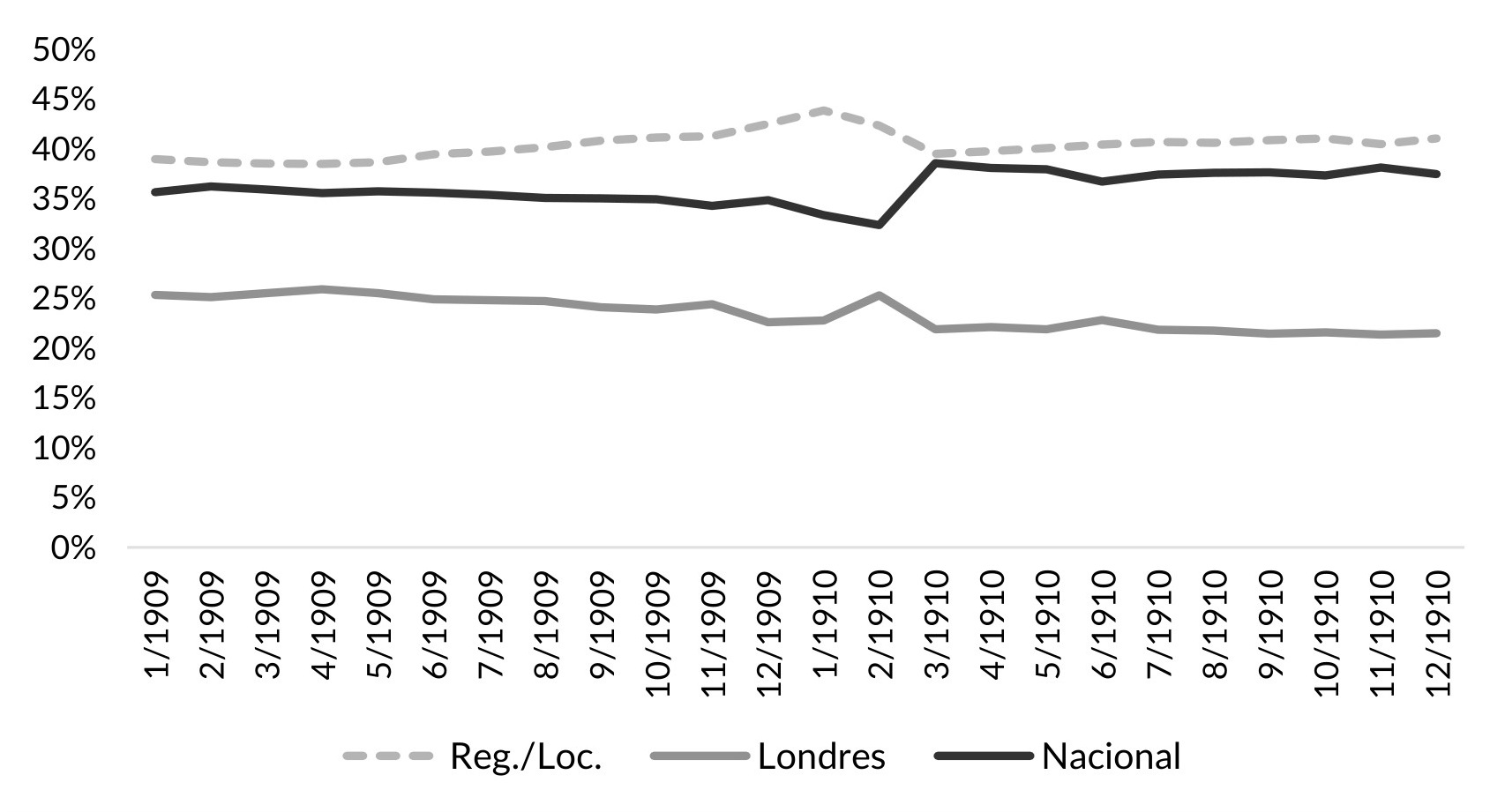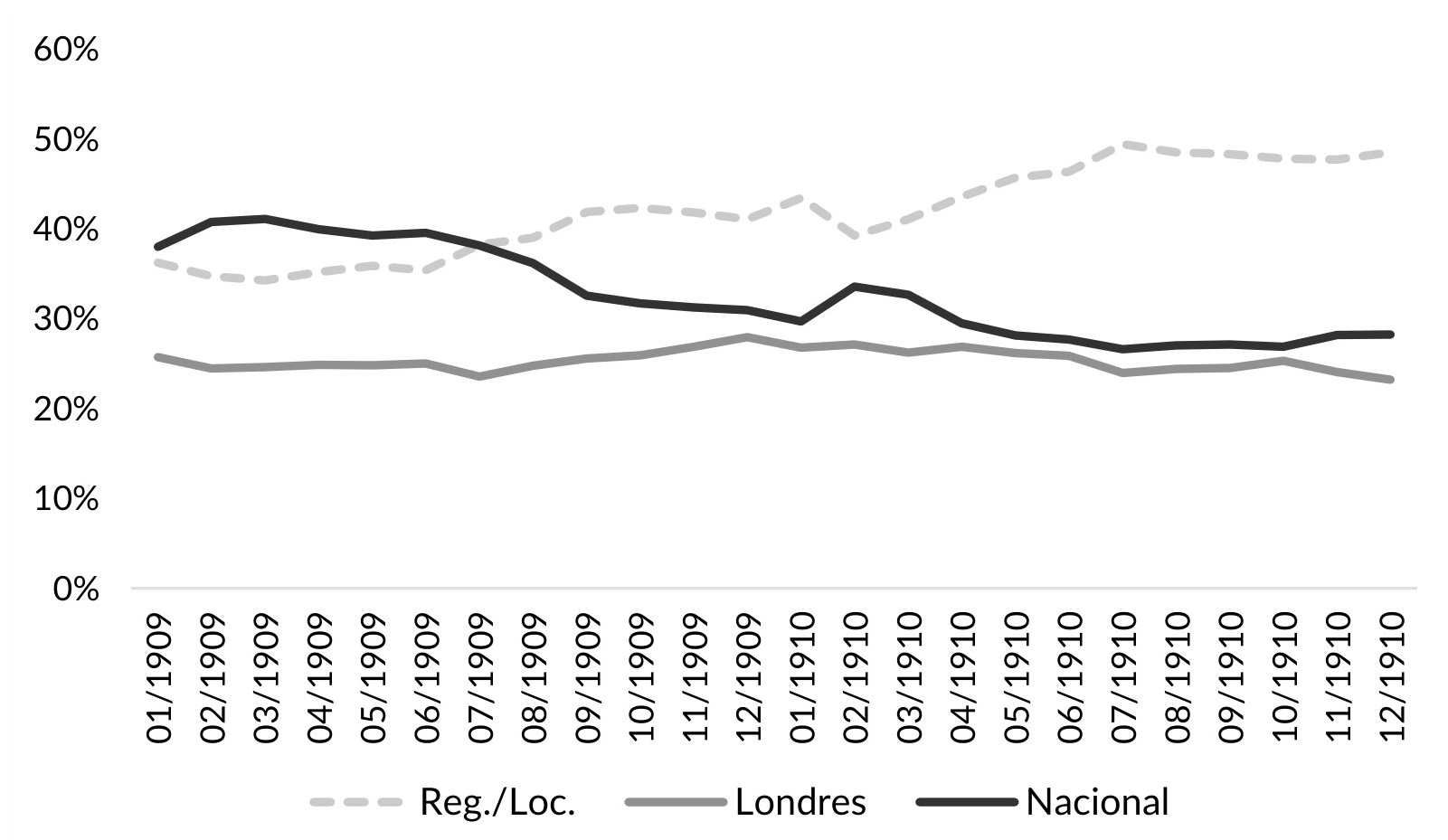 Después de la crisis de 1907-1908, el oro en poder de los bancos se incrementó de 44,34 millones de pesos en enero de 1909 a 53,69 millones en junio de 1910 (1% promedio mensual), y luego permaneció relativamente constante hasta diciembre de 1910 (véase Gráfico VI.1). Más que este aumento, lo importante por destacar es la mayor concentración del dinero de alto poder en las arcas del Banco Nacional. Antes de la crisis (1905-1906), el Nacional concentraba el 42% en promedio del metal amarillo; si agregamos el de Londres (22%), ambos bancos reunían el 64%. En los años poscrisis (1909-1910), el Nacional por si solo reunió cerca del 60%. Esto se llevó a cabo a costa de su rival capitalino (el de Londres) y de los bancos regionales/locales (véase Gráfico VI.2).