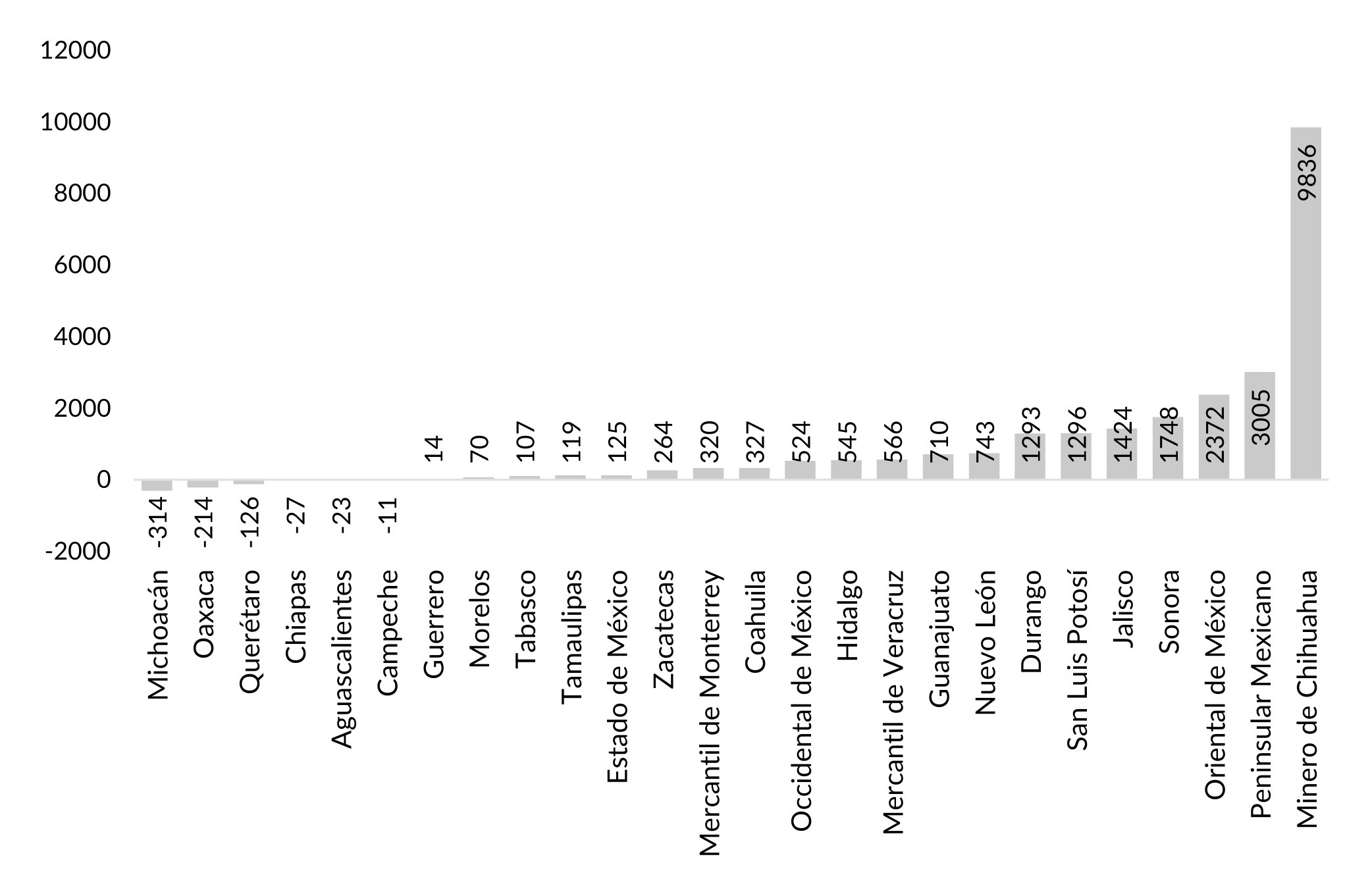 Mirando en el interior de la banca regional/local, el Gráfico VI.5 presenta la variación de los depósitos por banco. Los aumentos de los bancos Minero, Peninsular, Oriental y Sonora son los que más se destacan. Es de señalar que los Bancos de Michoacán, Campeche, Chiapas y Oaxaca muestran disminuciones debido a que desaparecieron como bancos de emisión. Los dos primeros, como vimos, se convirtieron en refaccionarios en febrero de 1909 y los dos últimos se fusionaron al Oriental en junio de 1909.[1] De hecho, los únicos que mostraron disminuciones (insignificantes) fueron los de Querétaro y Aguascalientes.
