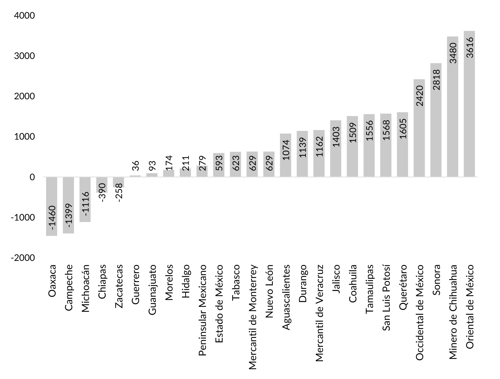 El Gráfico VI.7, por su parte, exhibe la variación del crédito en el interior de la banca regional/local. Nuevamente, los bancos de Oaxaca, Campeche, Michoacán y Chiapas mostraron una disminución de crédito debido a la fusión o su transformación en refaccionario. El único que registró una disminución (pequeña) sin experimentar alguna transformación de importancia fue el de Zacatecas. El resto de los bancos aumentaron sus créditos, en particular el Oriental, el Minero y el de Sonora. El banco Peninsular, a pesar de que registró un importante crecimiento de los depósitos, actuó de manera conservadora incrementando sus créditos en una cuantía pequeña.
