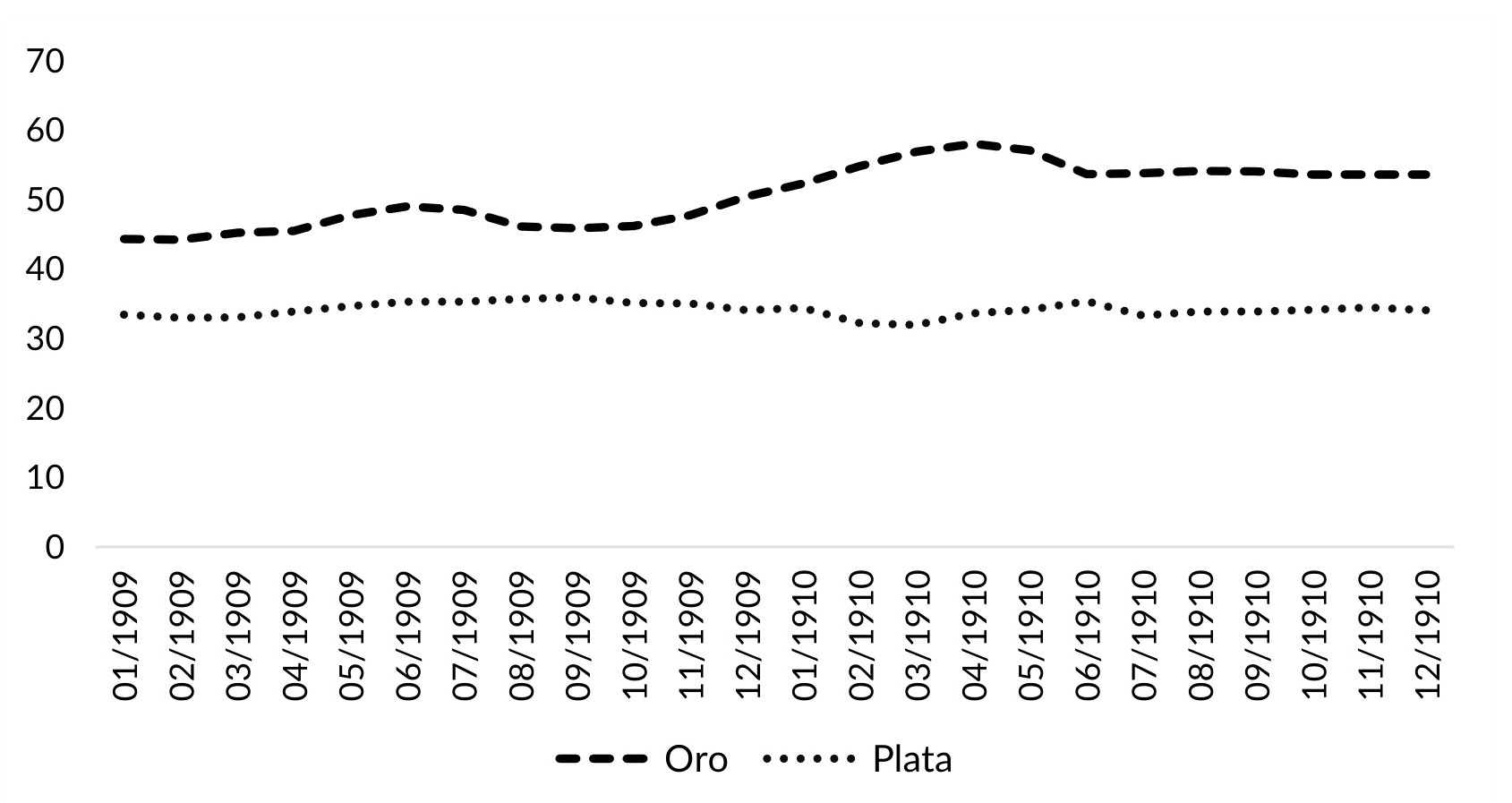Gráfico VI.1. Oro y plata en poder de los bancos, enero 1909-diciembre 1910 (millones de pesos plata)