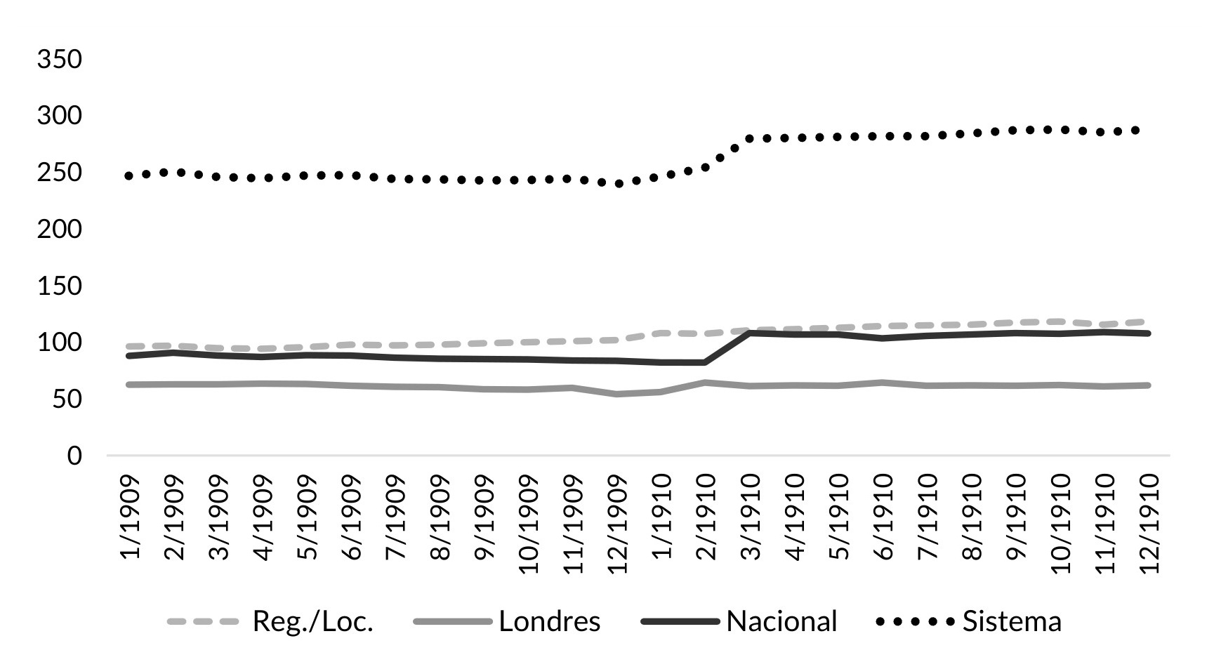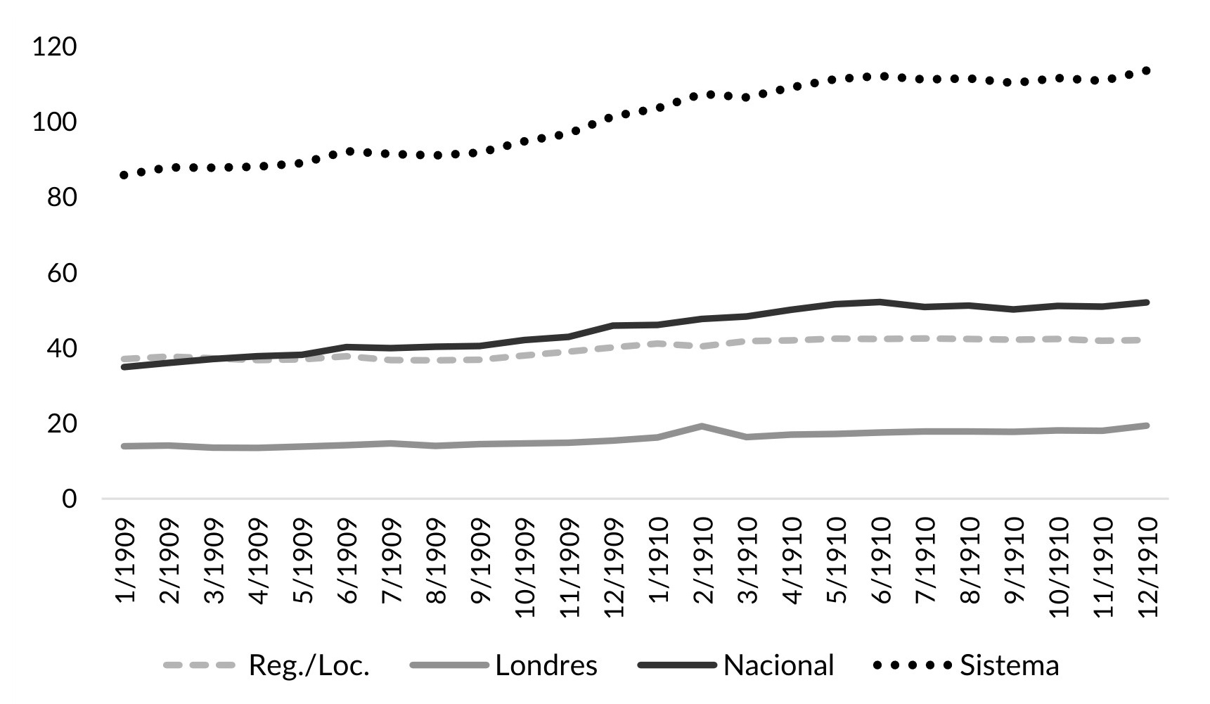 Llegando a la base de la jerarquía, encontramos un comportamiento diferente al de las capas superiores de dinero. Los depósitos del sistema aumentaron un 27% entre enero de 1909 y diciembre de 1910 (1% promedio mensual), producto principalmente del crecimiento de los depósitos de los bancos regionales (2,3% promedio mensual). Al final del periodo (diciembre de 1910), estos representaran casi el 50% del total, y los del Nacional, solo un 28% (véase Gráfico VI.4). Por consiguiente, en los años posteriores a la crisis, el público confió en depositar sus ahorros en los bancos regionales/locales. Pero, cuando se trataba de los billetes, el público prefirió los del Nacional, el que (como se vio en el capítulo II) tenía implantaciones a lo largo y ancho del país.