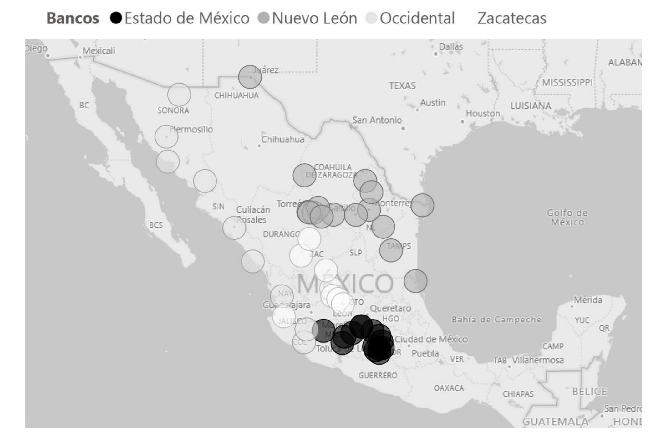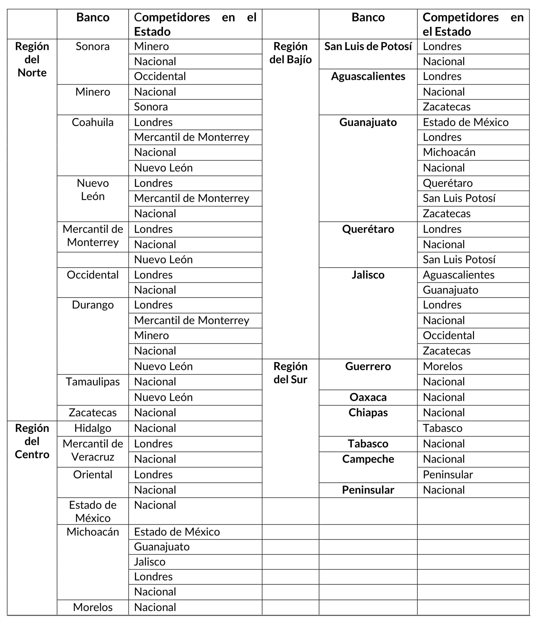 En cuanto a los bancos de los Estados, algunos de ellos –los menos– abrieron oficinas (sucursales y agencias) solo en plazas ubicadas dentro del mismo Estado donde operaba la casa matriz; otros –la mayoría (71%)– lo hicieron además en plazas ubicadas fuera del Estado donde operaba la casa matriz.[46] Empero, para este último grupo, regía el máximo legal sobre el número de tales oficinas. Así, revisando la implantación de los cuatros bancos provinciales (Nuevo León, Occidental de México, Zacatecas, y Estado de México) que se destacaron por el alcance de sus redes, observamos que su expansión estuvo limitada a una región en particular. De allí que los bancos provinciales, en conformidad con el alcance de sus redes, pueden considerarse como entidades regionales/locales, a diferencia de los bancos de Londres y Nacional con alcances a nivel nacional.