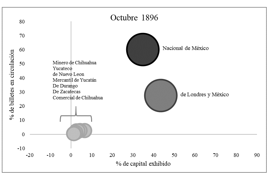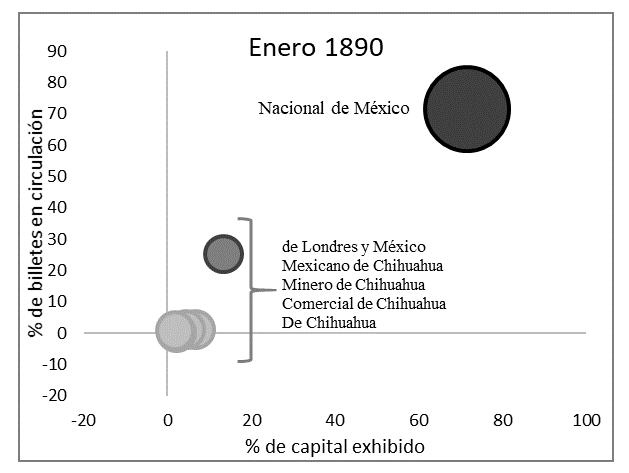Terminado el debate, la banca de emisión porfiriana quedó compuesta por el Banco de Londres y México, además del Nacional de México, ambos con domicilio legal en la capital[22], y cuatro entidades bancarias ubicadas en el estado de Chihuahua: el de Santa Eulalia (posteriormente, Comercial), el Mexicano, el Minero y el de Chihuahua. Estos obtuvieron la concesión federal entre 1888 y 1889.
