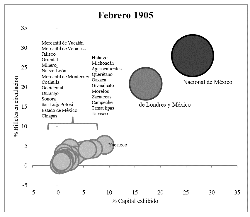 Por último, después de sortearse la crisis de 1907/1908, el sistema aún mostró una mayor concentración a favor del Banco Nacional, que siguió ocupando el lugar exclusivo de empresa grande. El Banco de Londres, en su posición de empresa mediana, exhibió un mayor distanciamiento con el Nacional después de la crisis, y los bancos regionales/locales continuaron como empresas pequeñas, distinguiéndose el banco Peninsular –fusión del Yucateco y el Mercantil de Yucatán– (véase Gráfico II.3.).