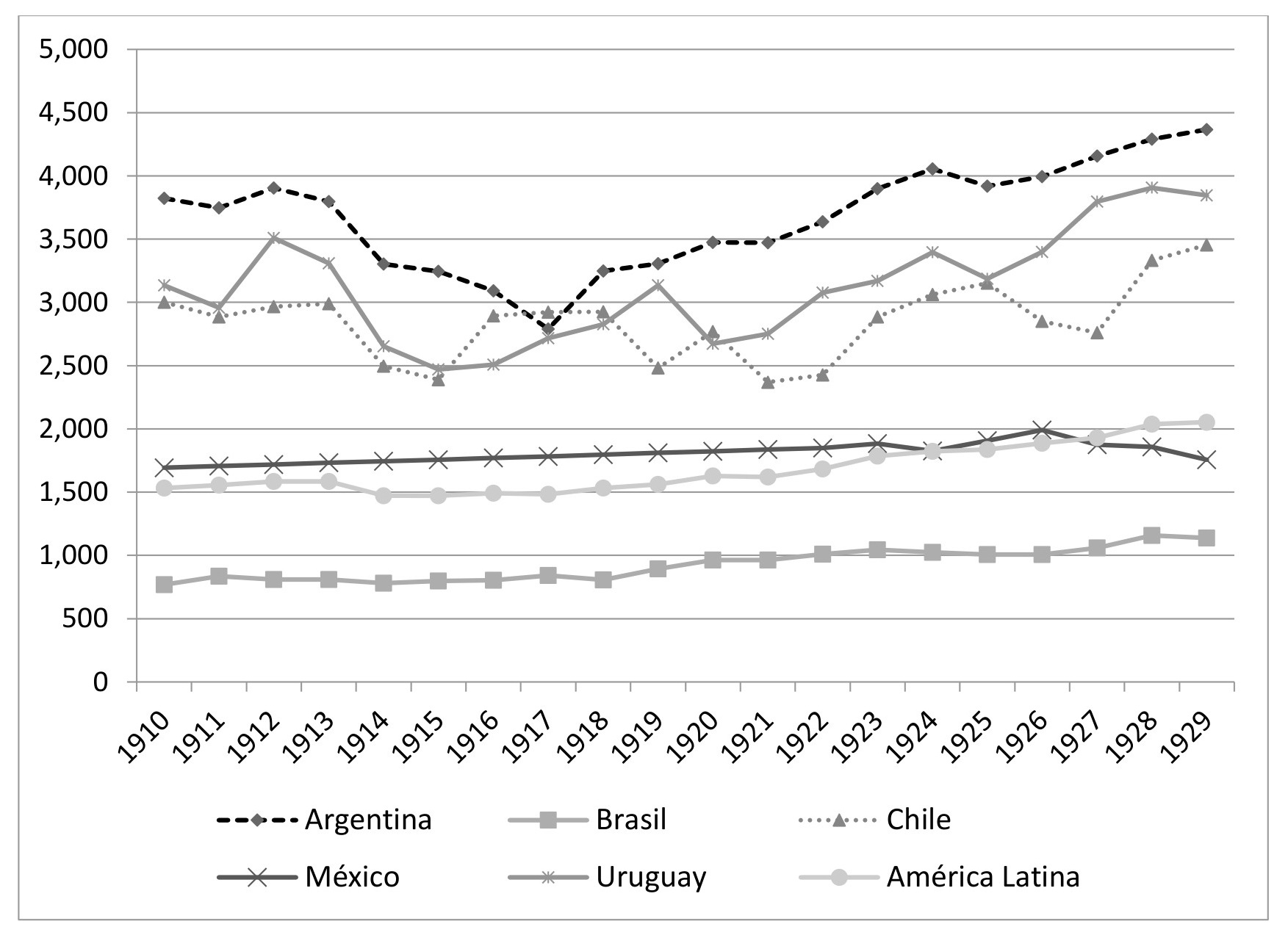 Gráfico 2. Evolución del PBI per cápita de los países de América Latina, 1910-1929. En Us$ de 1990