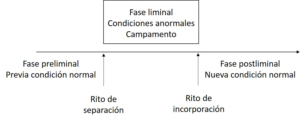 De hecho, el umbral, o el concepto de límite de Agamben, nos llevan a la idea de concebir el campamento como espacio de paso. Retomando a Marín y Espinosa (2017), entendemos la transición de las y los exguerrilleras/os como un rito de paso, conforme a la teoría de los “rites de passage” del etnólogo Arnold van Gennep (1909/2013) y el proceso ritual de Victor Turner (1988). Según Gennep, los ritos de paso marcan las transiciones más importantes en la vida humana de la sociedad. Los ritos emblemáticos son el nacimiento, la iniciación, el matrimonio y la muerte, sin embargo, otros procesos marcados de transición pueden ser interpretados como ritos. Ritos que tematizan o, incluso, efectúan un cambio, por ejemplo la transición de un periodo de la vida a otro o un cambio en el estatus social. Los ritos aportan a preservar la estabilidad de la sociedad, mientras codifican la posición del individuo en su estructura. Si bien esta investigación no discute las diferentes objeciones frente al trabajo de Gennep, adopta el concepto de “periodo liminal” de su pensamiento para el análisis de las zonas de desmovilización.