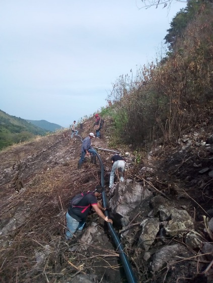 “Cómo se logró conseguir una conexión de agua traído de las montañas altas en Tierra Grata es un ejemplo de esfuerzo colectivo” (VFAO, 6/4/2019), al igual que la apropiación de un espacio con el objetivo de hacerlo apto para los cultivos. Por la falta permanente de agua empezó el proyecto de integración comunitaria en mayo del año 2018, guiado por la FAO, con recursos del Fondo Europeo para la Paz, acompañado por la ONU, para contribuir a los proyectos productivos que son la base de la futura seguridad alimentaria de las y los excombatientes. Se pensó en construir una escuela, en adecuar una cancha de fútbol y también en el proyecto del agua. Finalmente, la obra se inició en agosto del año 2019, trayendo el agua de los caudales del río en las montañas. Cabe mencionar que las y los excombatientes del ETCR ya habían empezado antes a recaudar dinero para su proyecto de agua potable. Después de más de 1.000 jornadas entre excombatientes, miembros del ejército y la comunidad se logró traer el agua a esta tierra. Eso fue la primera condición para poder permanecer en la zona y seguir construyendo planes para el futuro de la comunidad.