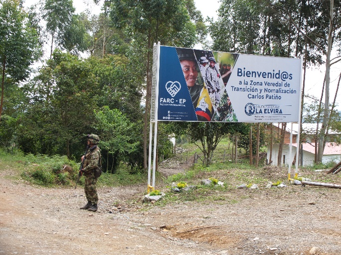 El papel del ejército para acceder a los campamentos ha cambiado significativamente en el transcurso de nuestra investigación. El 28 de marzo de 2017, cuando estuvimos por primera vez en la ZVTN La Elvira, tuvimos que registrarnos y pasar un retén militar. Al llegar a la zona de recepción nos pararon unos excombatientes y llamaron a un responsable para hablar con nosotros, pero no pudimos entrar a ninguna parte del campamento debido a que todavía no habían entregado sus armas. A partir del agosto de 2017, terminado el proceso de la dejación de armas, la entrada a los ETCR es de libre acceso, no existe ningún tipo de retén, o anillo de seguridad. Entonces nos dio la sensación de acceder a un espacio civil como cualquier otra vereda en Colombia.