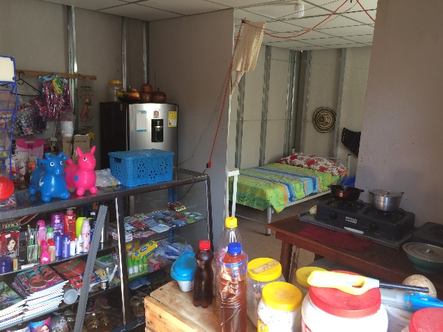 El lote se divide en dos sectores: el sector uno contiene 190 alojamientos, una biblioteca, oficinas de administración, enfermería y primeros auxilios, cocina, comedor general y un área de esparcimiento. El sector dos se encuentra debajo de las montañas y más cercano a la vereda La Elvira. Tiene 102 alojamientos, dos aulas, comedor, cocina y terraplén para cancha deportiva. “Este último sector pertenecía a la empresa Agroforestal El Naya S.A., así que algunas casas de madera quedaron para el uso de las y los excombatientes” (Diario de campo, AH,[9] 13/10/2017). Además, en el transcurso de la desmovilización se construyó el polideportivo que hasta hoy en día se usa para torneos de fútbol y eventos para la integración con las comunidades aledañas. En cambio, la zona alta de viviendas que fue construida completamente de nuevo con panel yeso está bastante apartada. En general, la vida pública sucede en el sector del polideportivo. Observamos que esto tuvo efecto en la división de labor entre diferentes jerarquías de las FARC-EP. Por su ubicación estratégica para organizar el contacto con el público y las instituciones, los comandantes y personas con tareas específicas se mantuvieron en la zona de recepción y algunos de ellos incluso eran alojados en las casas de madera. Al mismo tiempo en la zona de atención al público “se encuentra el restaurante, la tienda, la panadería, el salón para consultas médicas y el carro móvil de capacitación informática” (Diario de campo, AH, 13/10/2017), lo que demuestra una división espacial y funcional muy marcada en este campamento.