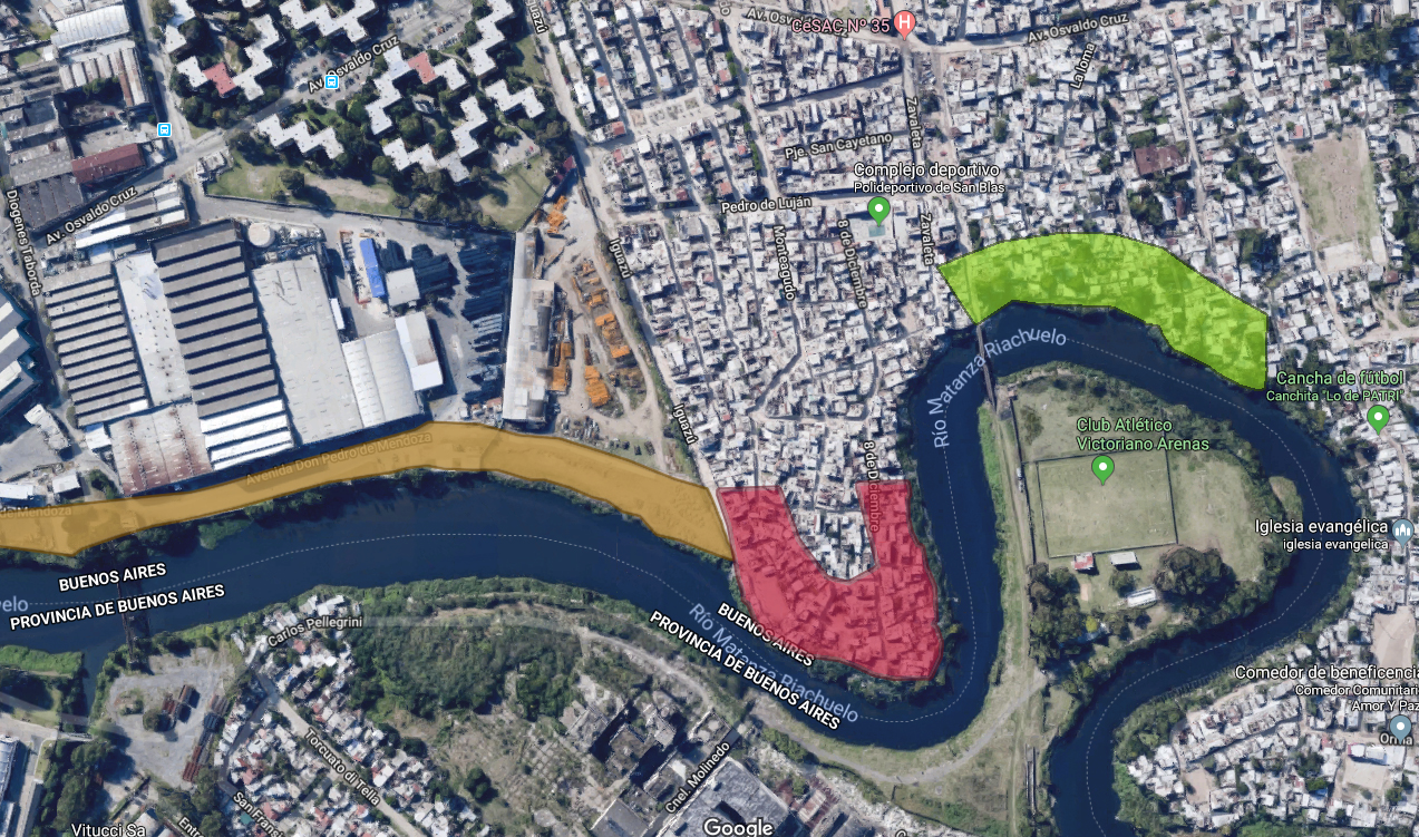 Sin embargo, el acercamiento de la población al río no le otorgó a éste una entidad especial en la vida pública del barrio, ni lo volvió parte activa de la cotidianeidad de los habitantes costeros. Para quienes vivían cerca –y quienes aún lo hacen, como es el caso de tantos que aún esperan la relocalización al momento de escritura de este capítulo–, no es más que un curso de agua tóxica oculto tras el laberíntico paisaje, que sólo se revela al conjunto cuando durante las tormentas el Riachuelo asciende e ingresa al barrio, invadiendo los taludes e inundando las casas. Mientras tanto, para quienes viven dentro de la villa pero lejos de él –incluso hasta a un kilómetro de distancia–, difícilmente habría motivos para acercarse a este escondido rincón del barrio. En la práctica, el río apenas constituye una frontera natural sobre la cual se balancean las viviendas de quienes no lograron hacerse de ningún otro lugar.