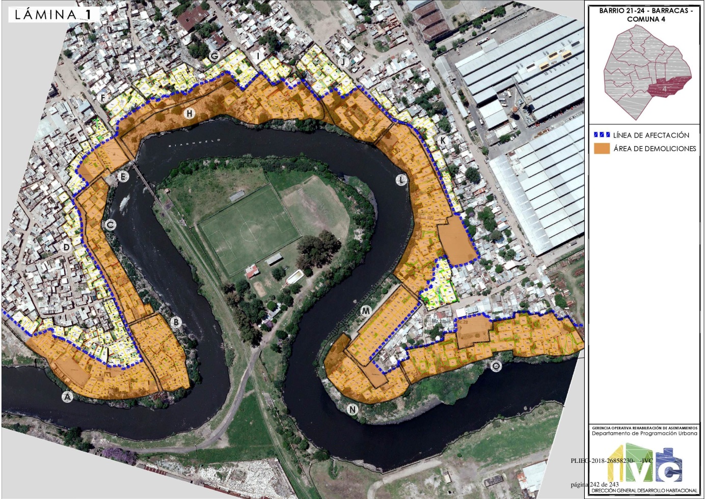 Las palabras de Raúl retratan el modo en que los primeros vecinos recibieron la noticia de la resolución del juez Armella, una orden que llegó como un repentino golpe a las puertas del barrio un día del año 2010. El ivc, junto con un amplio conjunto de agencias estatales, desembarcaron en la Villa 21-24 esparciéndose por las calles y rincones de la zona ribereña de la villa haciendo un relevamiento de la identidad de una población que a la vez que era “beneficiaria” del fallo judicial se interponía en el camino de su cumplimiento. Pero las tareas necesarias para darle curso a la orden del juez no eran sencillas: se debían constatar estados de salud, entrevistar familias, establecer criterios de prioridad para las paulatinas relocalizaciones y, fundamentalmente, determinar los 35 metros que conformarían el camino de sirga y acabarían generando la línea divisoria entre los “adjudicatarios” y los “no adjudicatarios” de nuevas viviendas en reemplazo de las que serían destruidas. Es que, para cuando el ivc comenzó a intervenir en esta zona de la costa del Riachuelo, el juez Armella ya había reconocido el derecho a la relocalización y por ende la delimitación del camino ribereño no implicaba la mera demolición y expulsión a destino incierto, sino que daba lugar a un complejo proceso de demarcación territorial y reubicación de miles de personas.