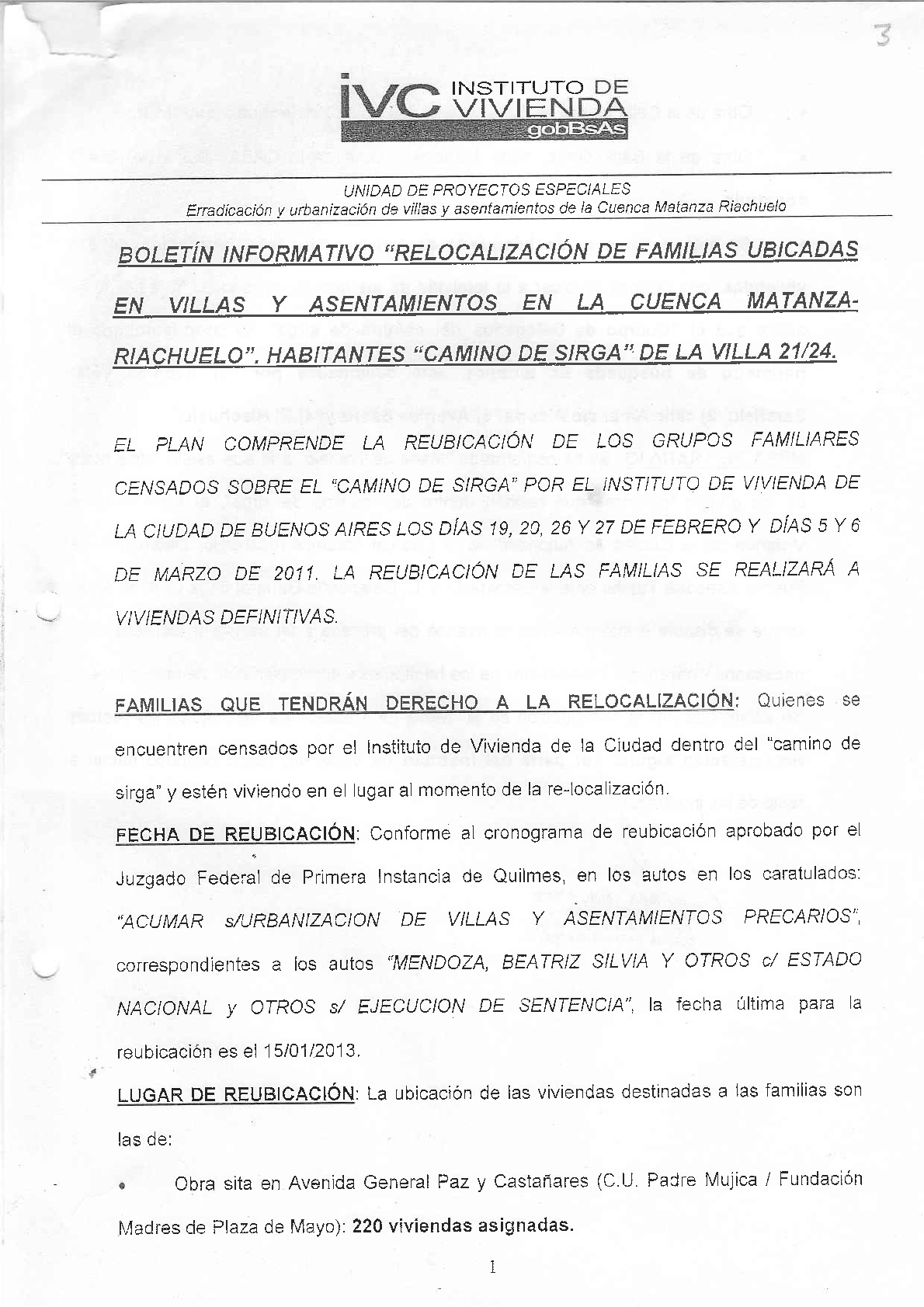 En los primeros meses de 2011, poco después de realizada la delimitación del camino de sirga y ya conformado el cuerpo de delegados, los reclamos de los afectados no tardaron en multiplicarse. ¿Qué zonas serían relocalizadas primero y bajo qué criterios? ¿Qué podría hacerse respecto de las deficiencias constructivas del complejo Padre Mugica, sobre las cuales cundían informes, artículos periodísticos y relatos de sus primeros habitantes? ¿Era posible generar una alternativa a ser trasladados al extremo sur de la ciudad? Y sobre todo, ¿por qué vías podrían plantearse las demandas al ivc?