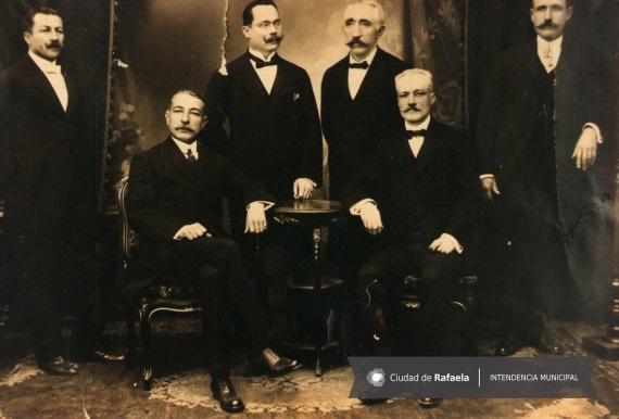 Imagen 6. 1º Concejo Deliberante junto al 1º intendente de la localidad. Sentados de izquierda a derecha: Manuel Giménez (intendente), Nicolás Gutiérrez (presidente). Parados de izquierda a derecha los concejales: Eduardo Chiarella, Emilio Galassi, Antonio Cossettini y Carlos Mognaschi (Rafaela, 1913) (Archivo Histórico Rafaela).