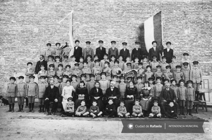 Imagen 2. Docentes y alumnos del Colegio Cossettini junto a integrantes de la Banda de Música (Rafaela, s/f) (Archivo Histórico Rafaela).