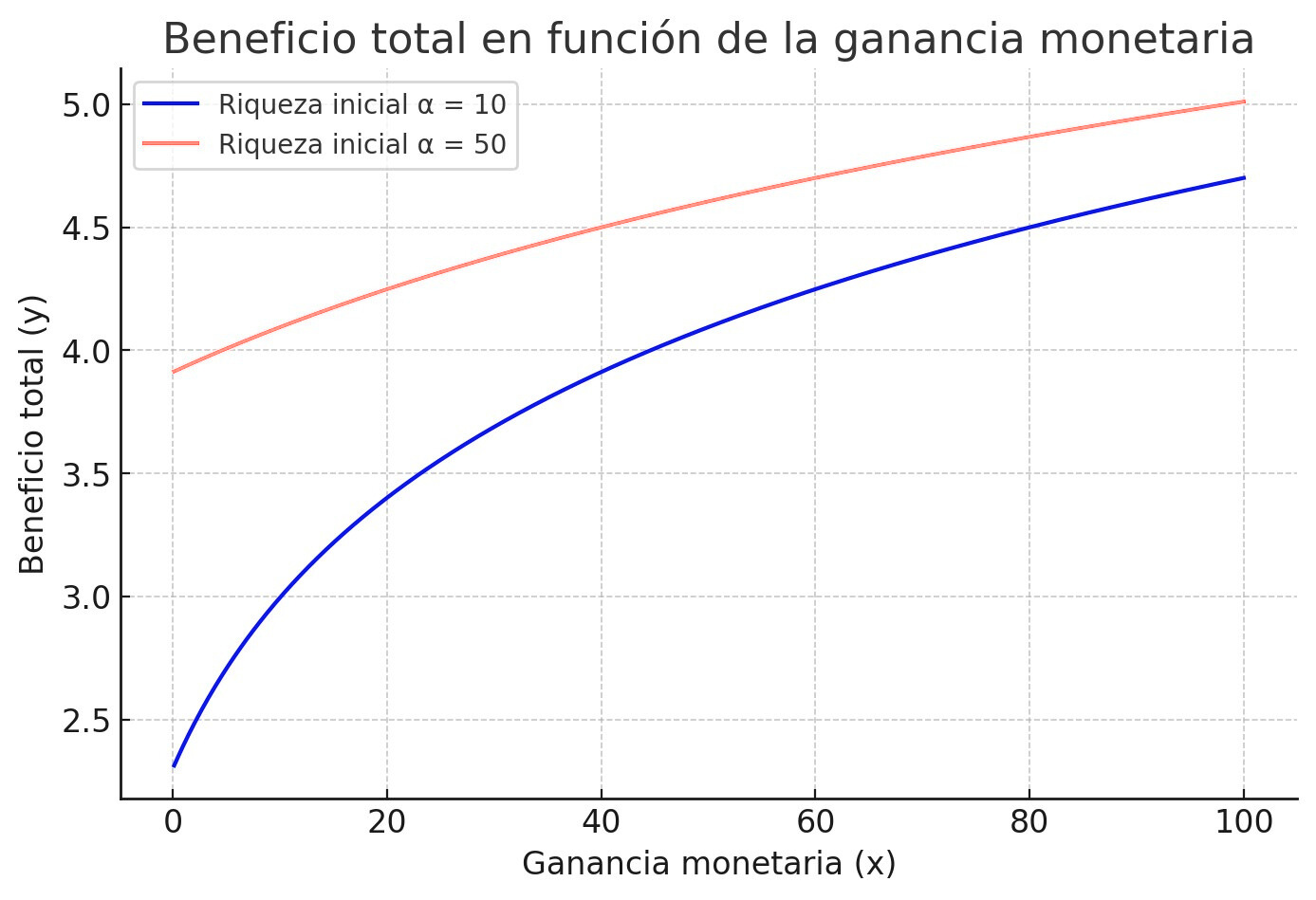 Ahora bien, el siguiente paso de Bernoulli fue identificar una relación plausible entre una cantidad de dinero x y el beneficio y asociado a ella. Su argumento fue que, al menos en general, el incremento del beneficio y que una persona con una riqueza α obtiene a partir de un aumento x de su riqueza es directamente proporcional a x e inversamente proporcional a α. Esto implica que el beneficio total y que una persona con una riqueza inicial α obtiene de una ganancia monetaria x está dado por el logaritmo natural de (α+x), es decir: