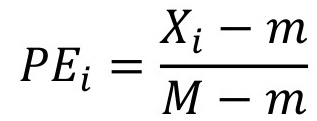 Donde PEi es el puntaje estándar, Xi es el dato original para estandarizar, mientras que m y M son respectivamente el menor y el mayor valor del indicador (Buzai, 2003).