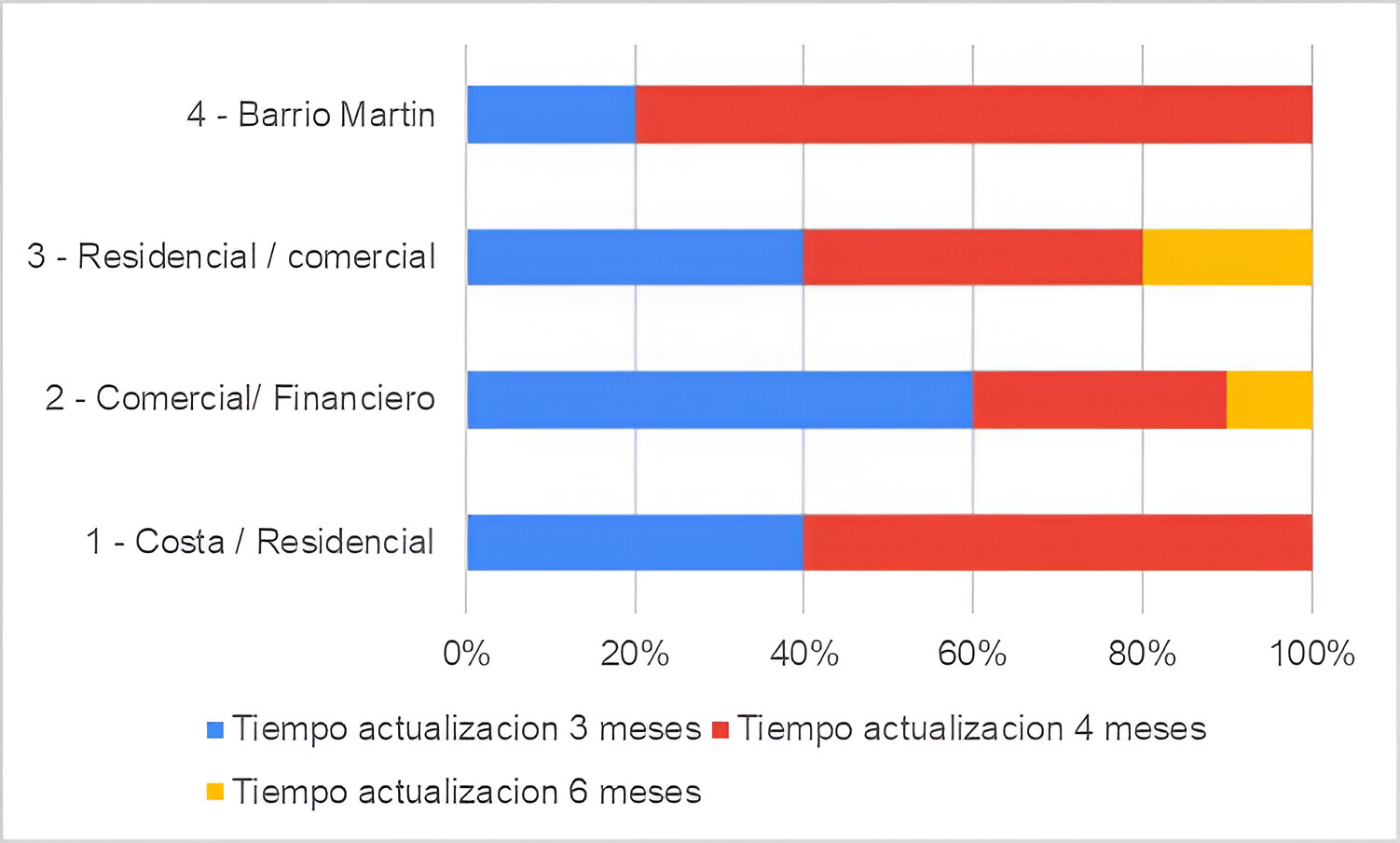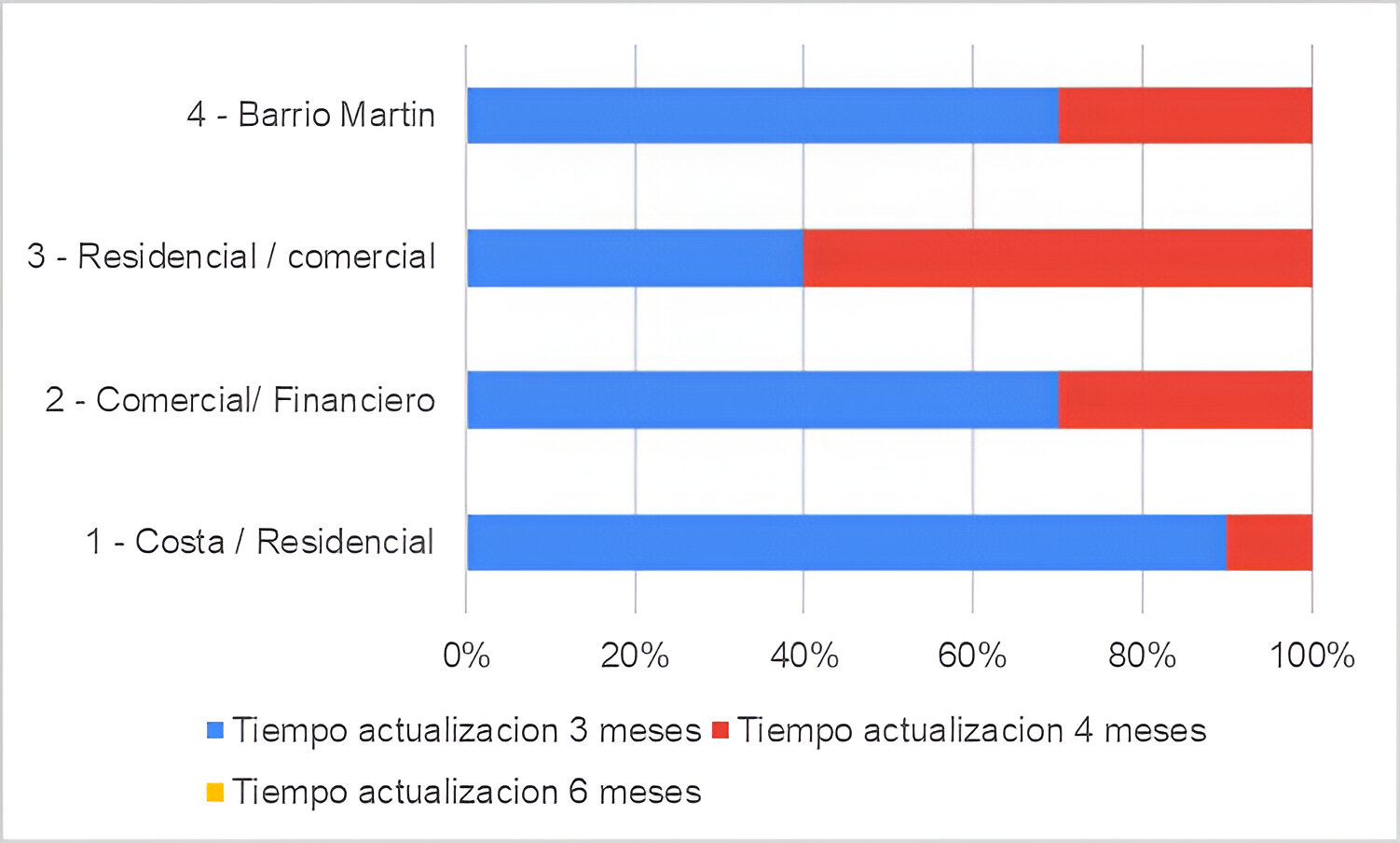 Los tiempos de actualización de los contratos más frecuentes son entre 3 y 4 meses, encontrando algunos casos aislados con una actualización de 6 meses en los departamentos de 1 dormitorio en la zona 2 (comercial/ financiero) y zona 3 (residencial/comercial), mismo tiempo que propone la anterior ley de alquileres. En los departamentos de 2 dormitorios prevalece la actualización del precio del alquiler cada 3 meses por sobre la opción de los 4 meses, siendo la opción mayoritaria en la zona 1 (Costa/residencial).