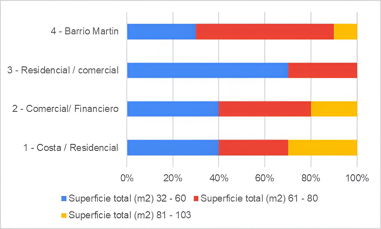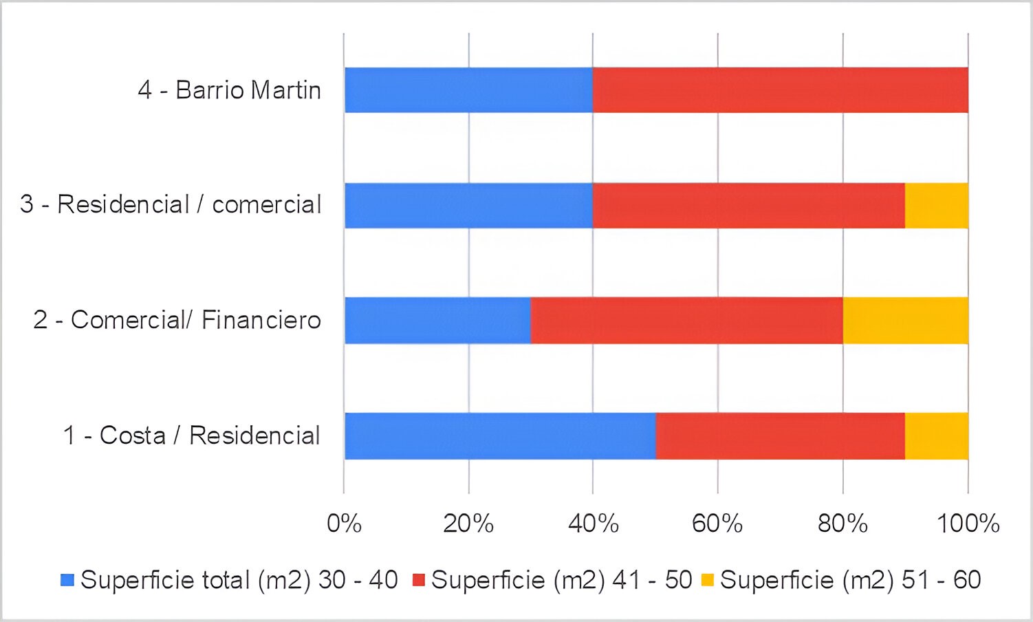 La superficie total de las unidades ofrecidas varía entre los 35 y 55 metros cuadrados en los departamentos de 1 dormitorio, incrementándose entre los 37 y 103 metros cuadrados en los de dos dormitorios. En Barrio Martin no se observan unidades de 1 dormitorio de más de 50 metros cuadrados y son pocas en las otras áreas. En general, dentro del universo de 1 dormitorio predominan en todas las áreas las unidades de entre 41 y 50 metros cuadrados de superficie total. Con respecto a los departamentos de 2 dormitorios se destaca la ponderación en casi todas las zonas de las unidades que tienen una superficie total entre 32 y 60 metros cuadrados, siendo mayoría en la oferta analizada en Barrio Martin.