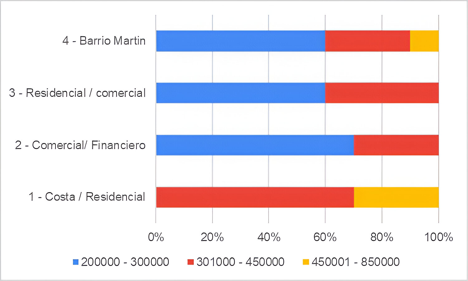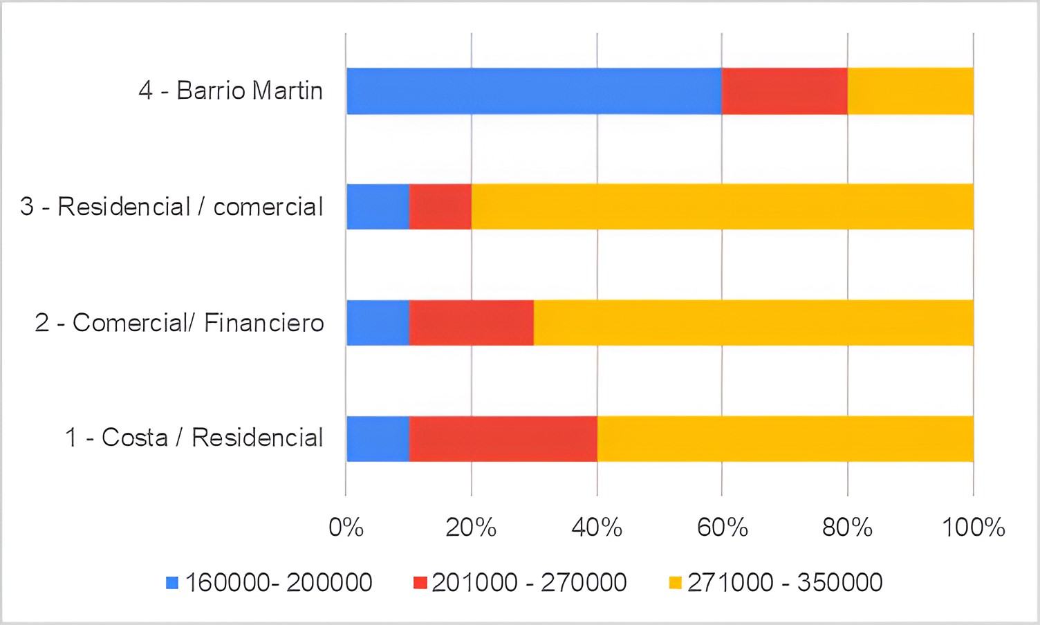 Al cruzar estos datos con las zonas, se observa que la zona 4 correspondiente a Barrio Martin concentra la mayoría de los departamentos ofertados dentro del rango más bajo dentro del área central, tanto en los departamentos de 1 y de 2 dormitorios. En contraposición, los departamentos ofertados dentro del rango más alto se distribuyen más uniformemente entre las zonas 1, 2 y 3, siendo mayor su porcentaje en esta última que corresponde al área residencial/comercial colindante con avenidas más concurridas como Pellegrini y Oroño, y más retirada del área más concentrada en términos comerciales y financieros.