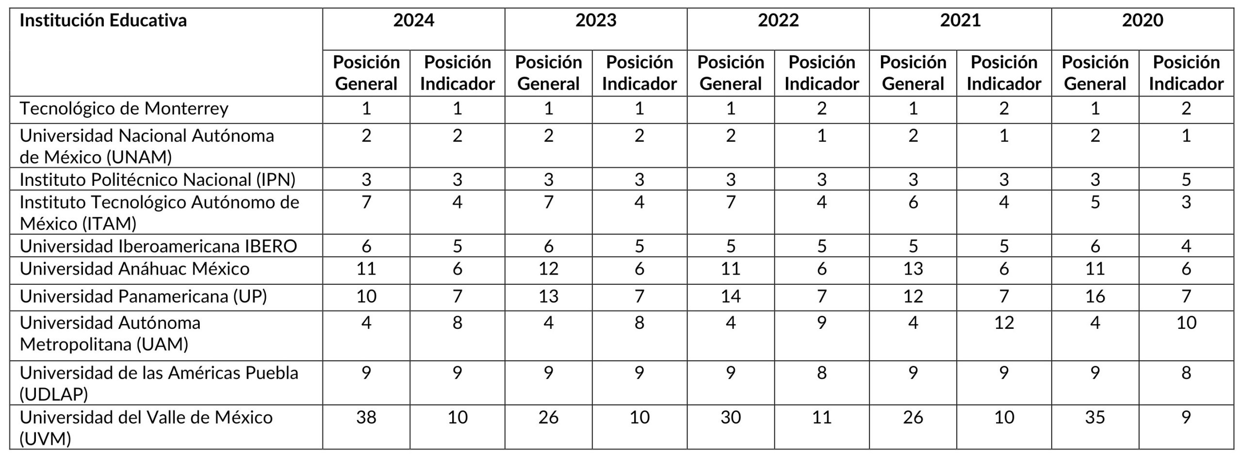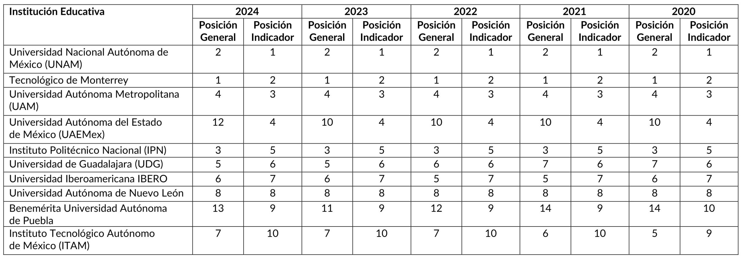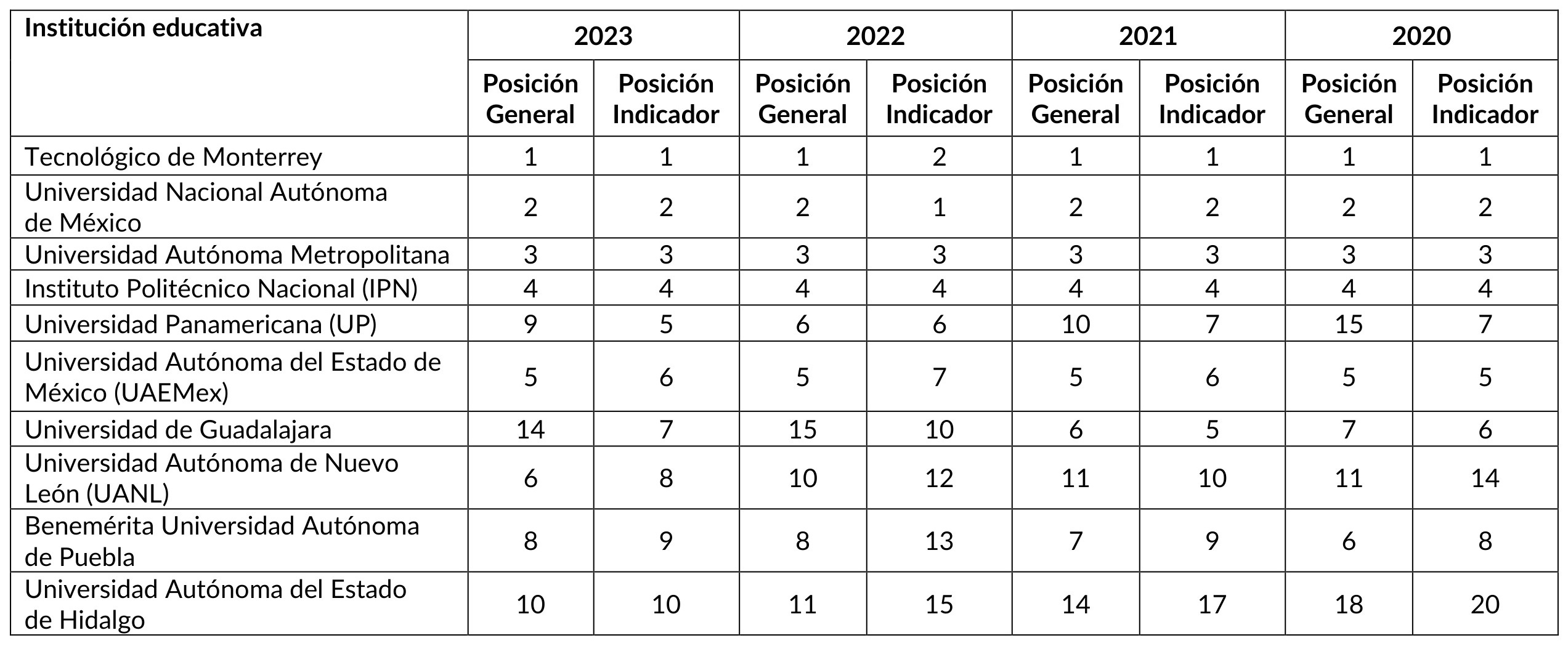 Al considerarse el enfoque en el puntaje general, se observa una continuidad dentro del top 5 en las instituciones de educación superior clasificadas. Sin embargo, es sobresaliente la mejora de la Universidad de Monterrey y de la Universidad Autónoma del Estado de Hidalgo al incorporarse a este grupo.