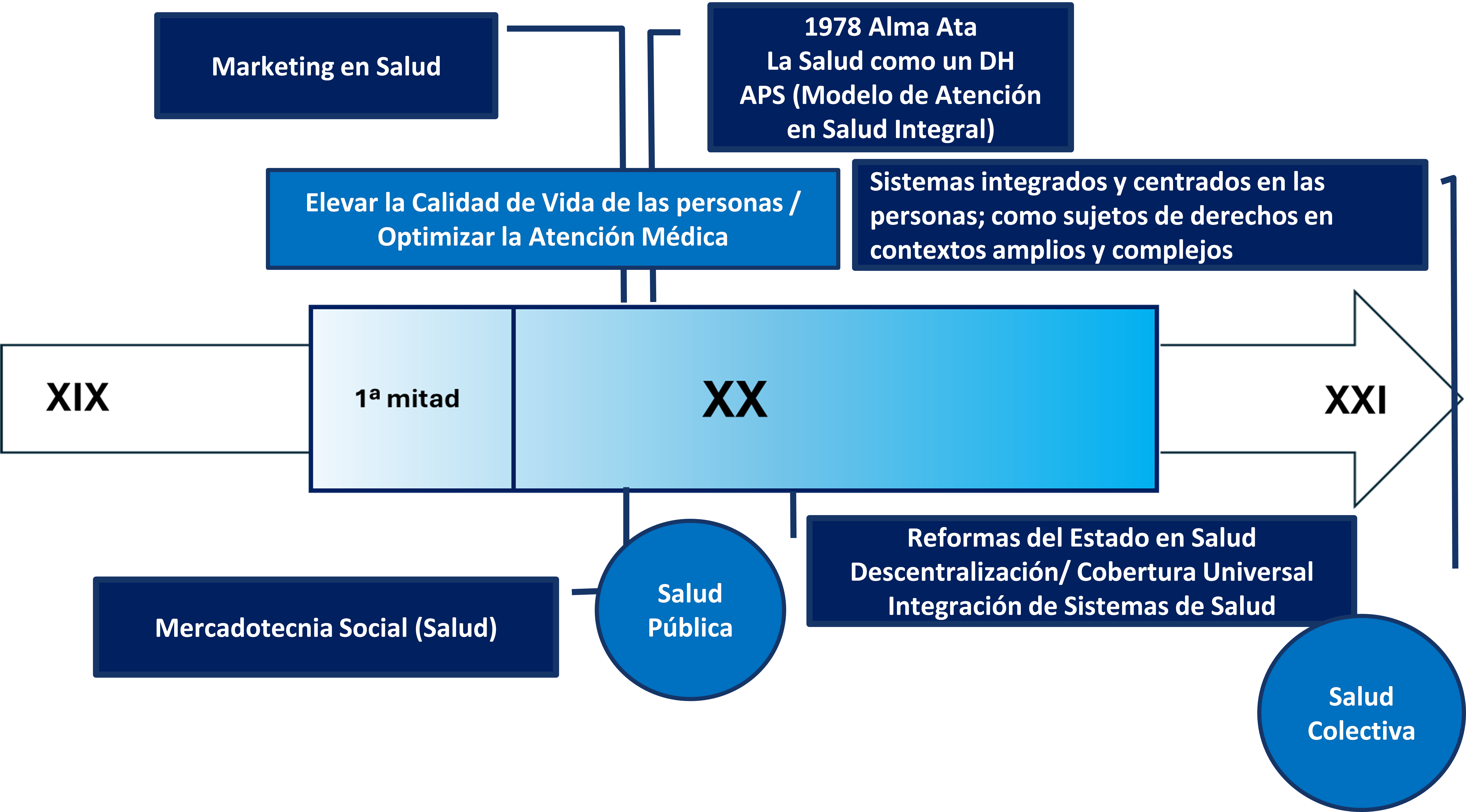 Justo en aquella década de los años 70 del siglo XX, se consolidaron conceptos colaborativos a los fines esperados, ya que, si bien se tenían antecedentes del origen del marketing desde finales del siglo XIX, en ese periodo la orientación en salud comenzó a implementarse en las instituciones del ramo, especialmente en los hospitales más prestigiosos de Estados Unidos y de algunos países de elevado desarrollo (figura 1).