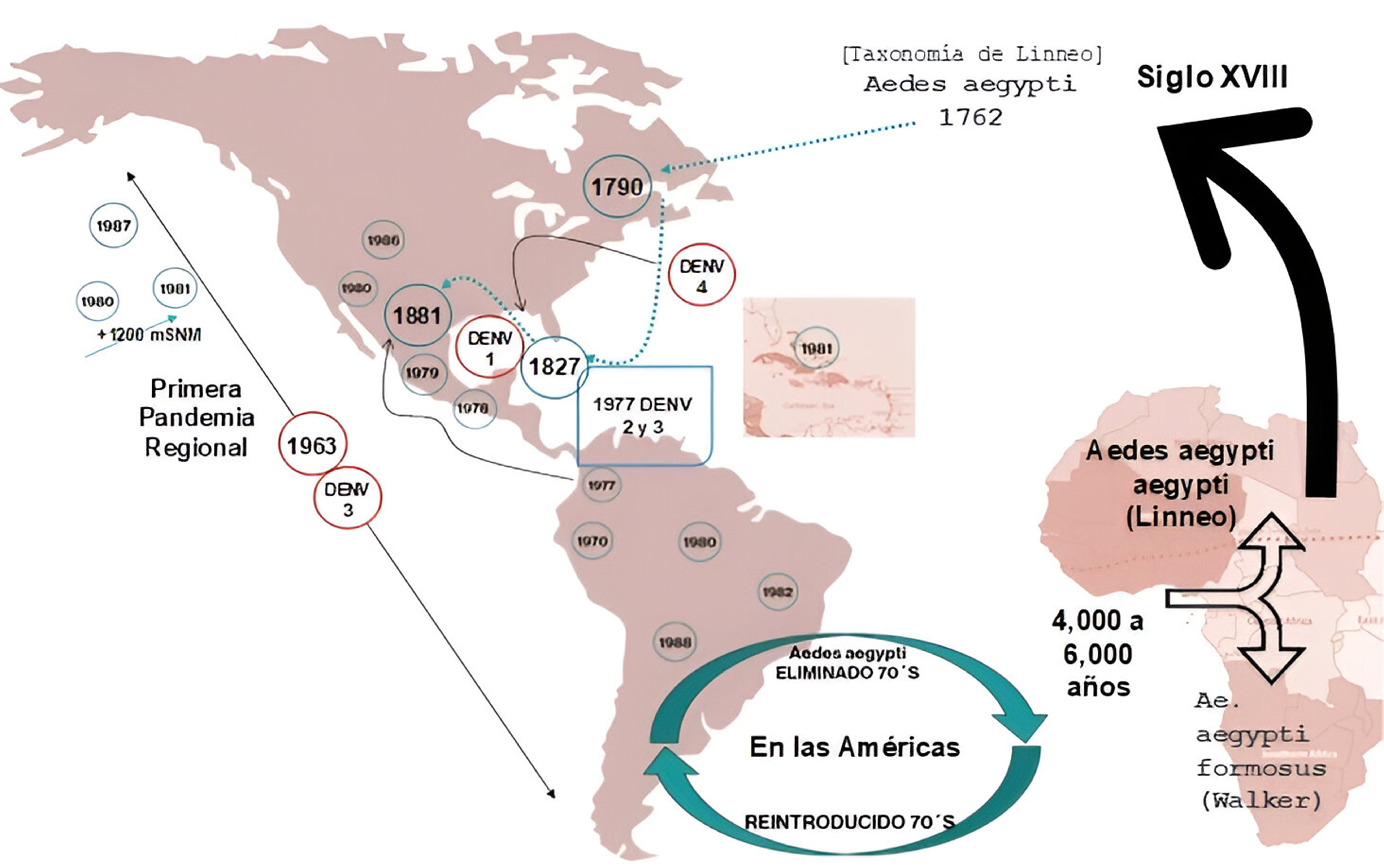 Figura 2. Evidencias de introducción del vector transmisor del dengue y la distribución de la enfermedad en las Américas