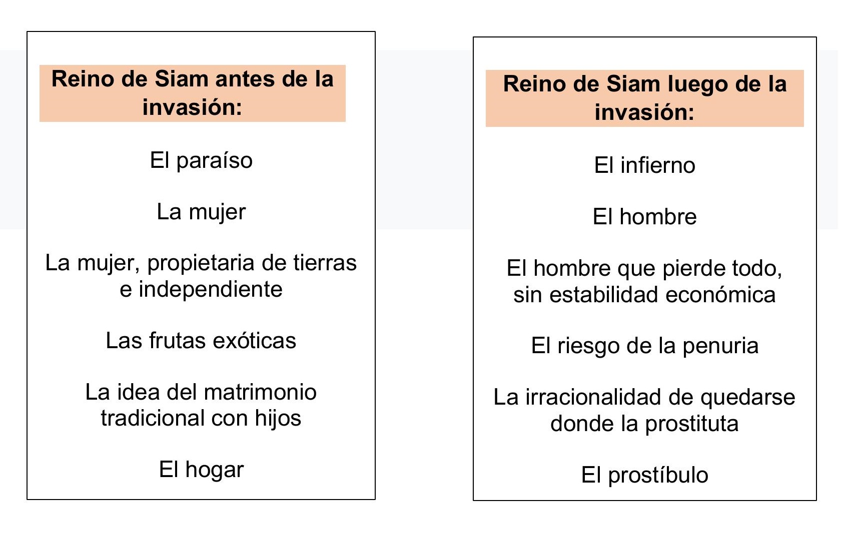 El texto comienza, entonces, precisando la situación geográfica: el título y el segundo párrafo mencionan la región de Siam, un reino que parece ser real. Tres veces se menciona ese lugar, recorriendo los caminos y describiendo la huida de todos los personajes de la historia. El reino de Siam es percibido como el paraíso en un cierto momento de la narración: “Lo habíamos perdido todo. Atrás habíamos dejado nuestras pertenencias, nuestras plantaciones de arroz, nuestros árboles de pan, de coco y mango” (Escudos, 2008, p. 12). Se narra que el reino de Siam ha cambiado, como ha cambiado –por cierto– el personaje principal del cuento. Siam era sinónimo de felicidad, de estabilidad y de abundancia de frutas exóticas pero luego, la invasión birmana transformó todo. Ya no es más aquella tierra paradisiaca.